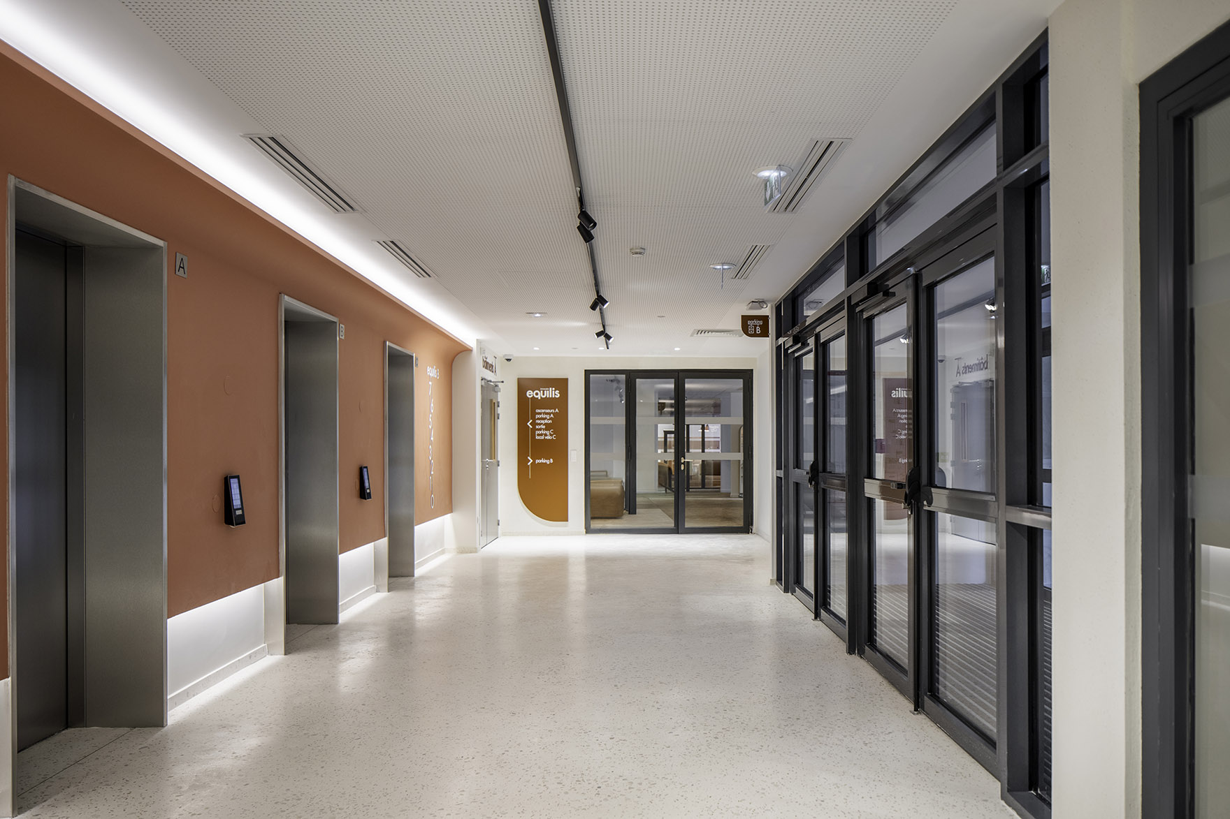 Un sol constitué de terrazzo est souligné en périphérie par un anneau de moquette couleur terre cuite, établissant un lien subtil avec l’environnement extérieur. Un lustre monumental, conçu spécifiquement pour le bâtiment, vient magnifier l’ensemble. Le recours à des lignes courbes participe à la cohérence formelle du projet et oriente subtilement la perception, tout en guidant naturellement le regard vers le centre. D’autre part, des strates sont mises en évidence par un jeu de lumière artificielle effleurant les murs. Ces strates sont constituées par un enduit décoratif composé de poudre de pierre - matériau éco responsable - conçu avec Signature Mural. Un autre enduit décoratif a été développé, venant créer un effet béton dont sa texture vibrante a été obtenue par l’ajout de sable évoquant celle de microcristaux. Sur les paliers d’étage sans apport de lumière naturelle, la courbe du hall est réinterprétée à travers les faux plafonds et le sol souple - idem pour le hall B. Ainsi l’apport de lumière se fait au plafond par un délicat jeu de courbe lumineuse de couleur terre cuite. Cette lumière est accentuée par l’ajout de rails lumineux directionnelles, qui soulignent la forme et instaure une ambiance théâtrale.