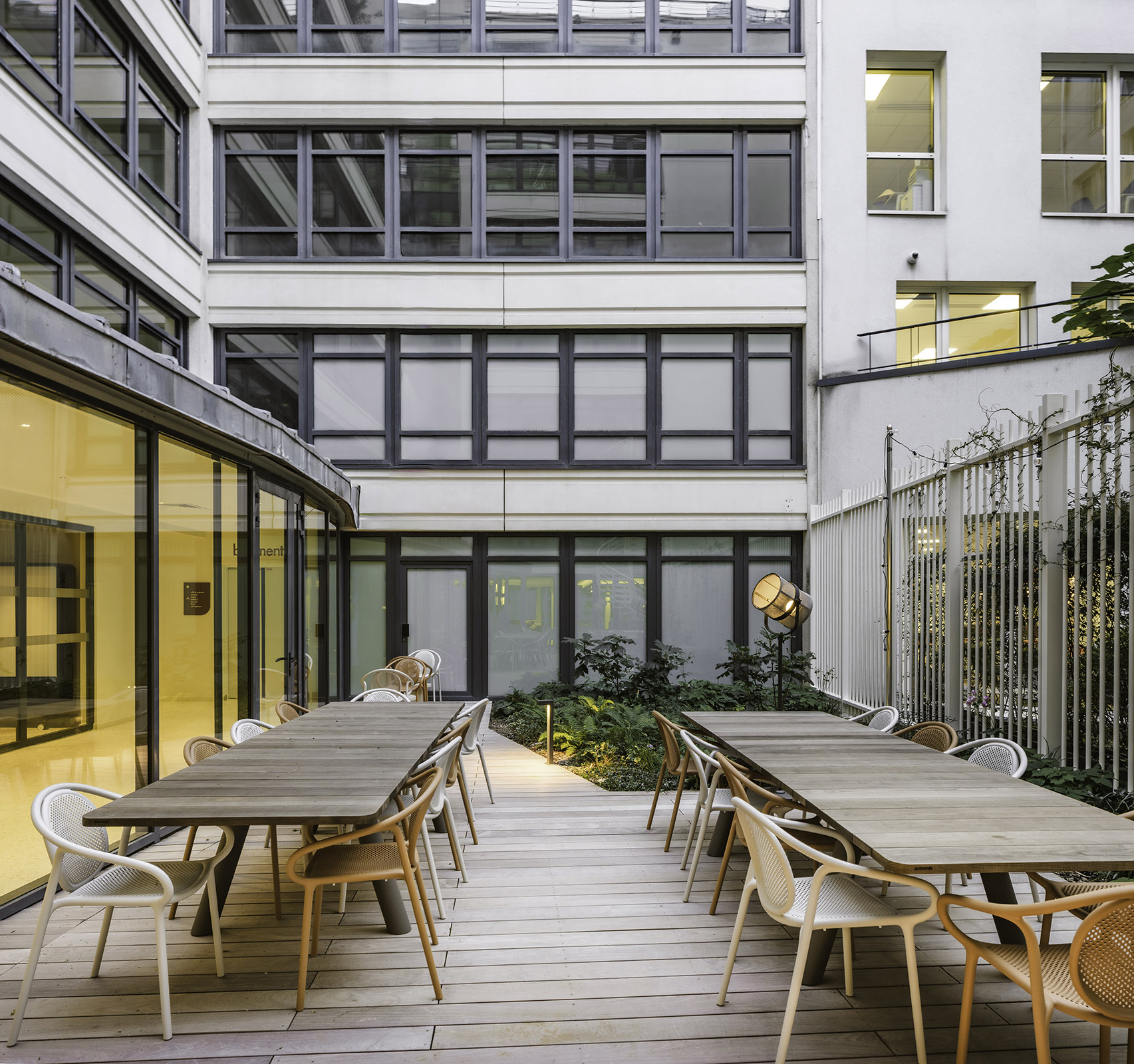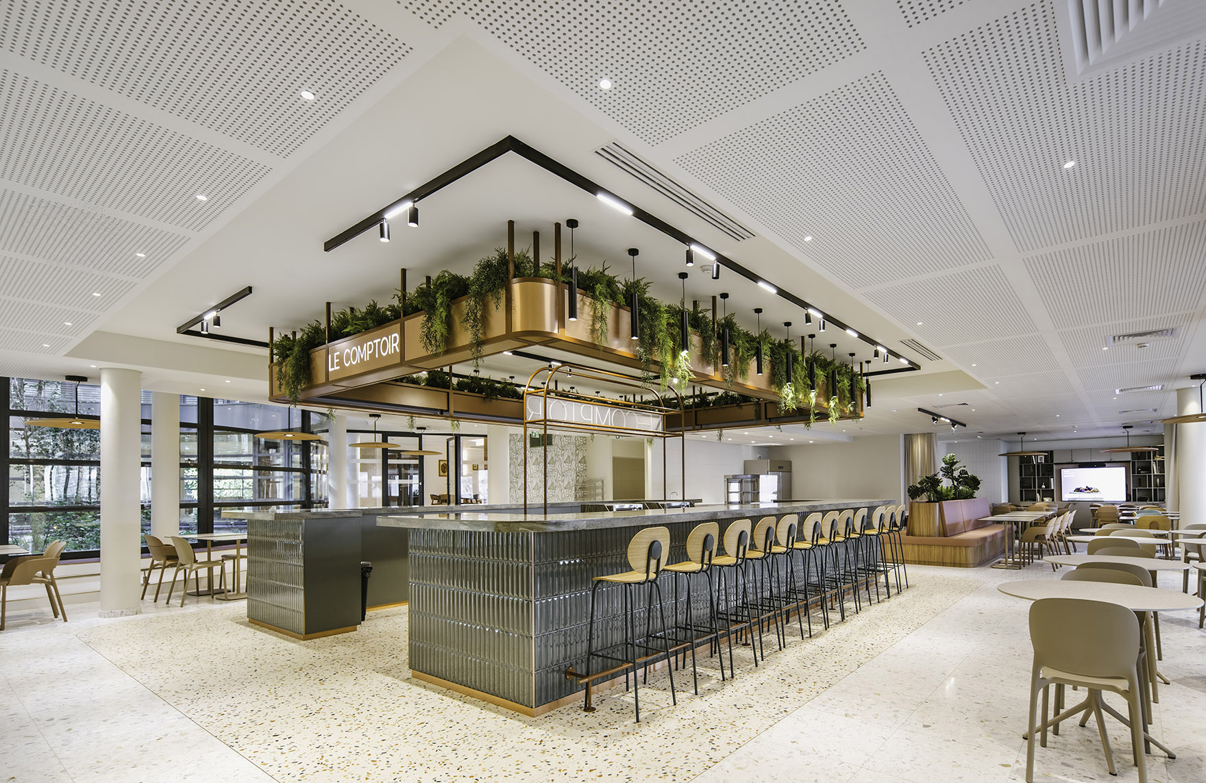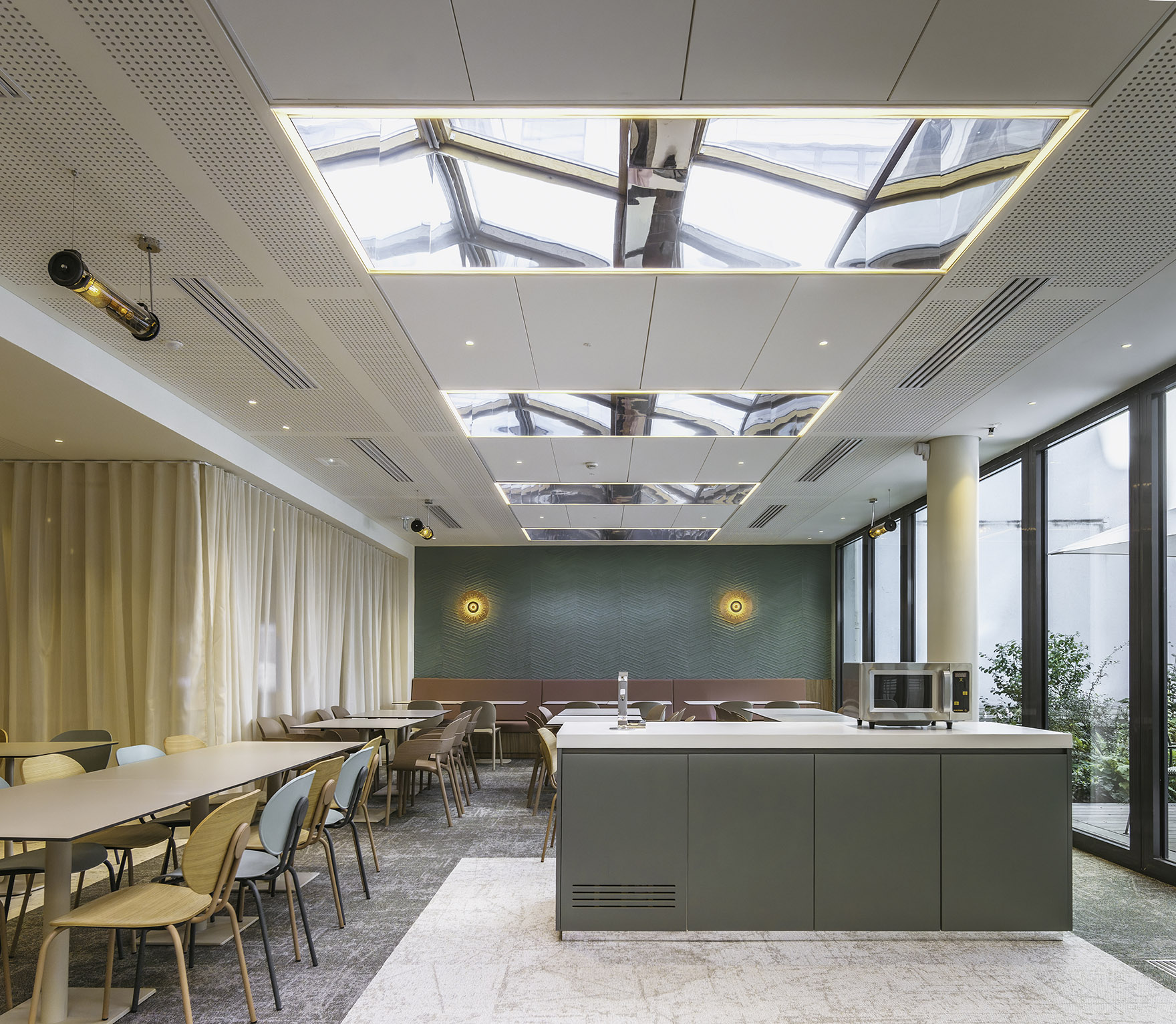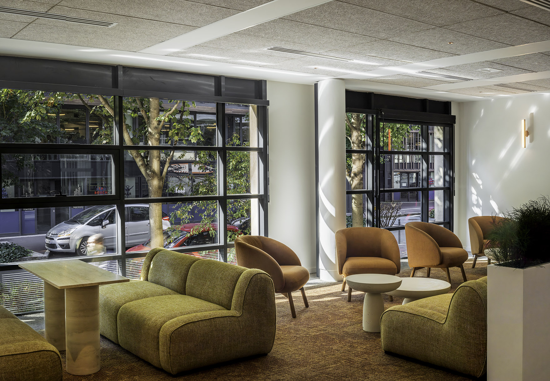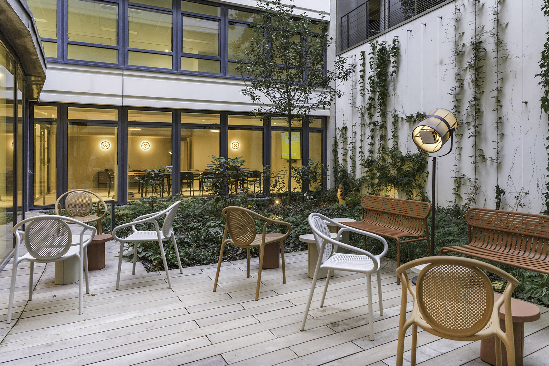 Pour Aliénor Bechu : « La démarche a été de s’accorder avec l'intention architecturale c'est-à-dire ouvrir le bâti sur la rue, avec une immense ouverture percée dans la façade, en continuum sur l’atrium végétalisé. La transversalité se prolonge jusqu’au restaurant, avec une transparence pleinement souhaitée et assumée. »