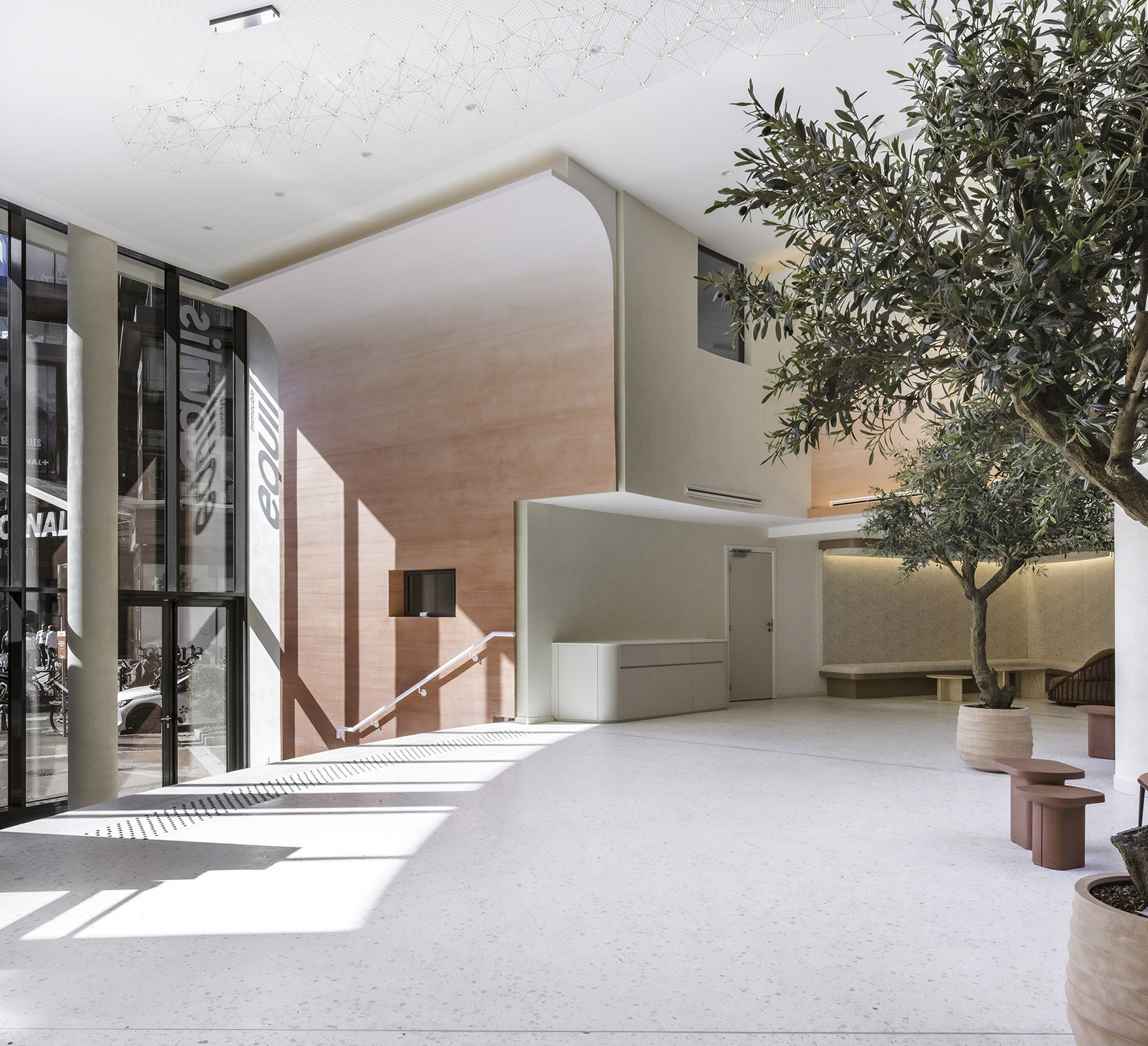 Pour Aliénor Bechu : « Un lien très fort se crée avec la nature à la fois grâce aux matériaux employés mais également par les couleurs. En effet, le hall d’entrée reprend les couleurs de la terre, du sol jusqu’au plafond, comme si nous entrions dans une grotte, menant jusqu’à l’atrium végétalisé. »