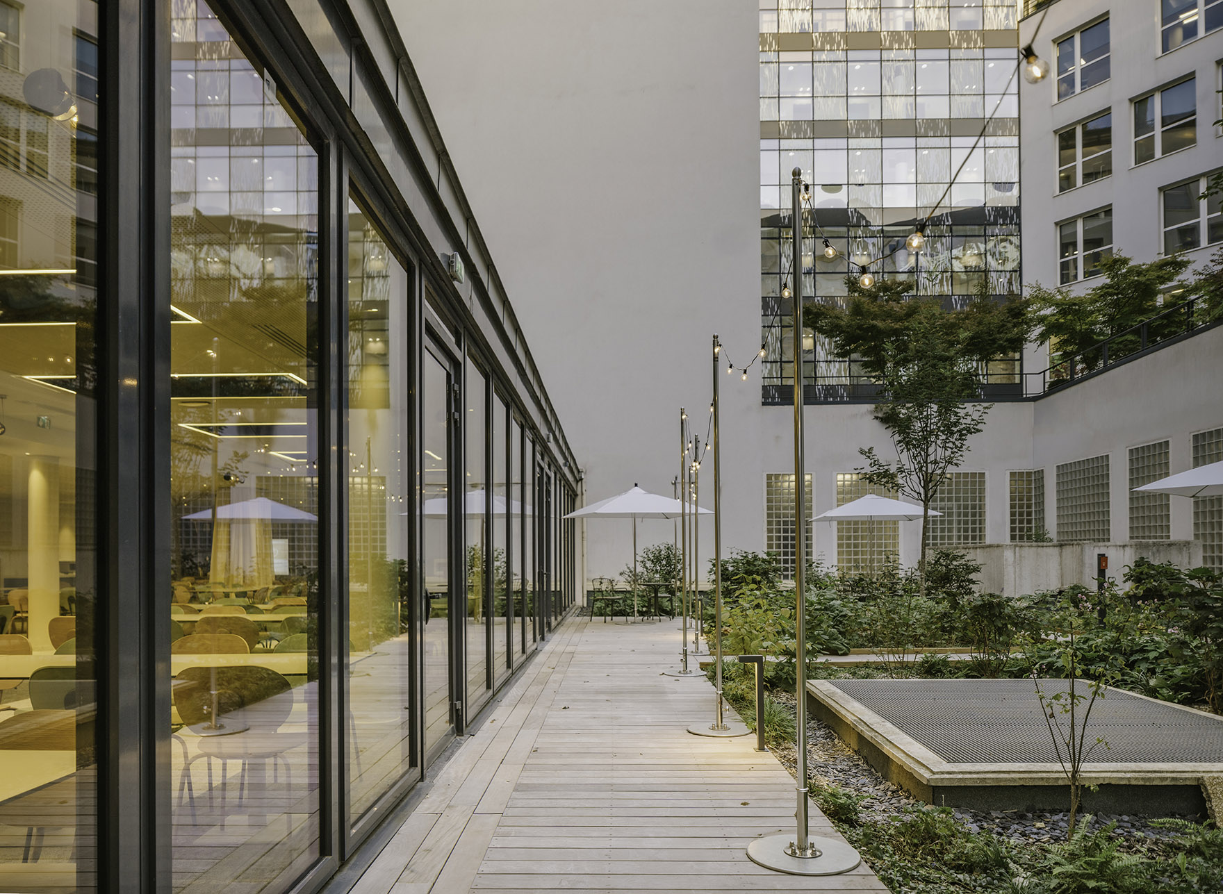 Les stries à l’horizontal guident l'œil du visiteur vers le cœur végétalisé et le restaurant.