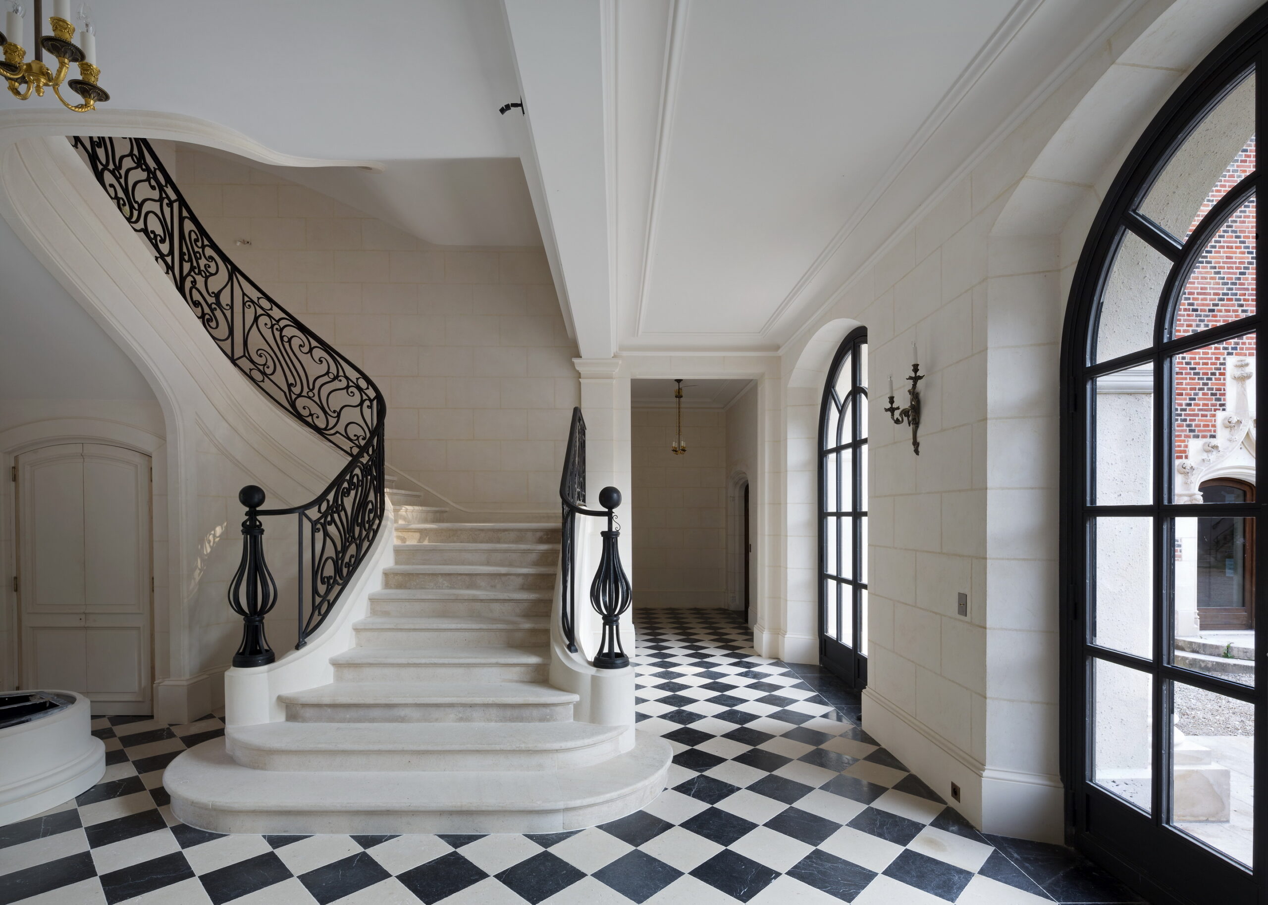 Le hall d’entrée dans lequel se trouve un escalier en pierre avec son garde-corps en fer forgé, donne accès à une série de salons en enfilade : bureau, fumoir, petit salon et grand salon.