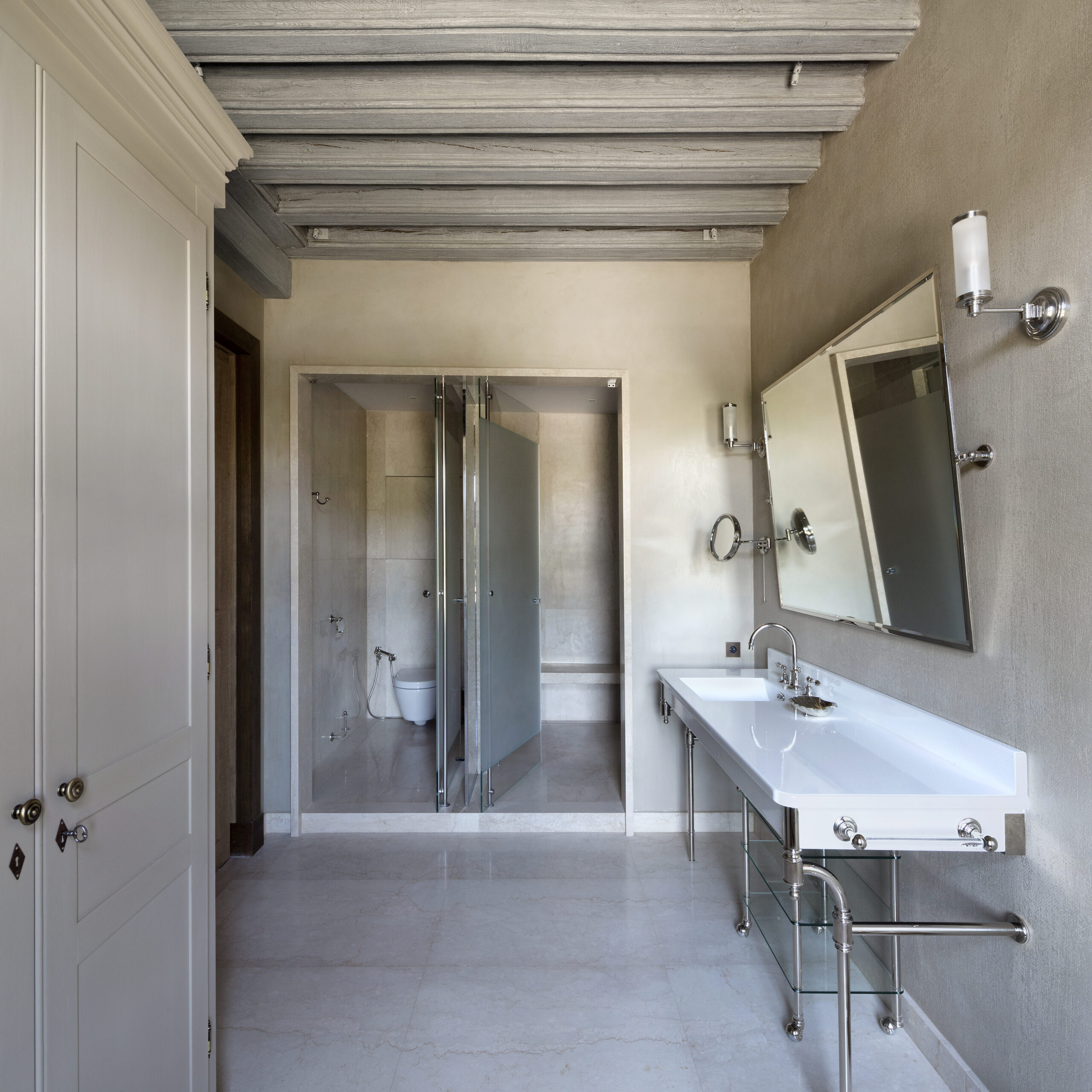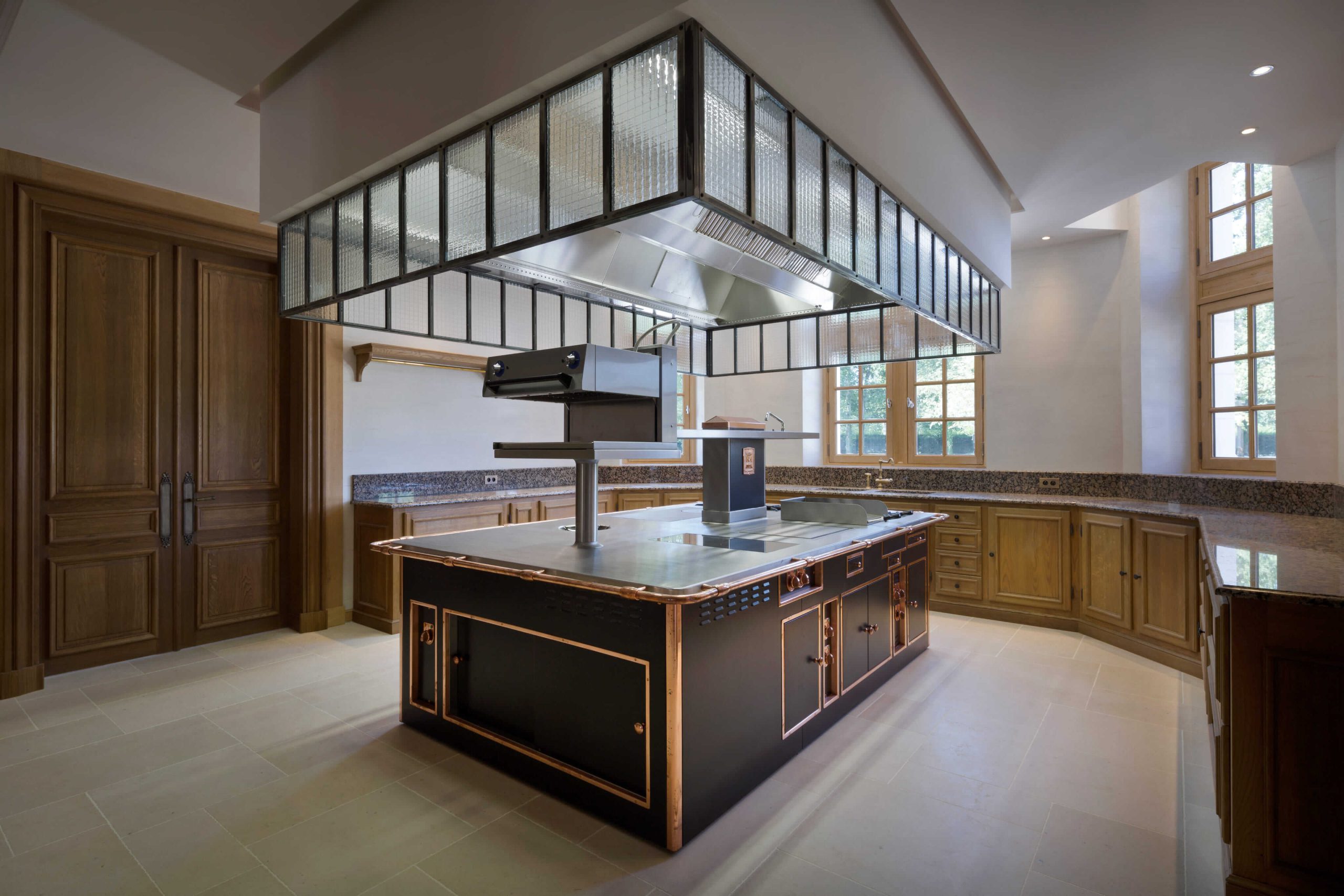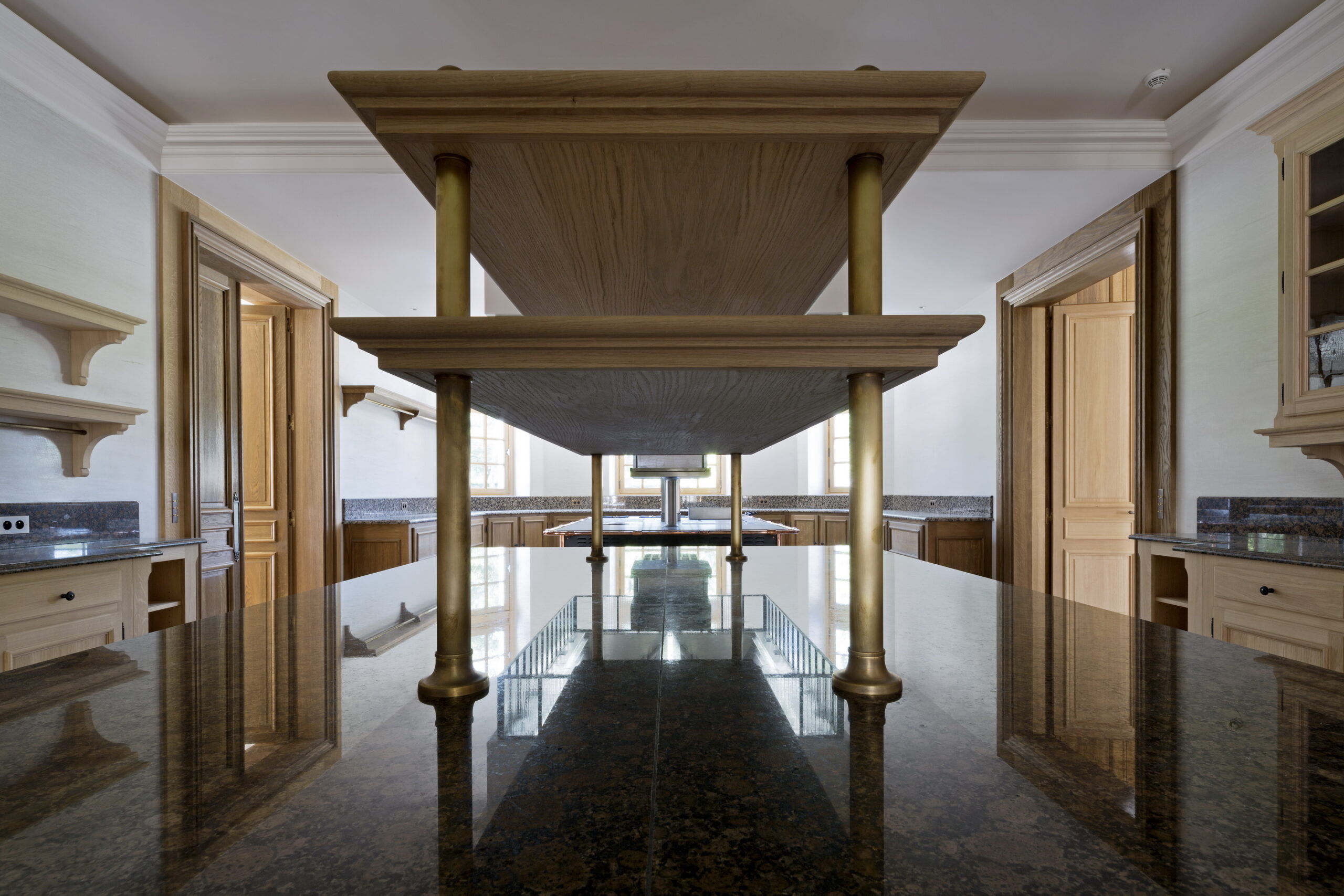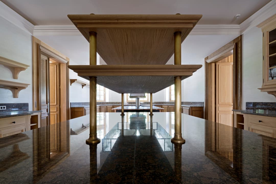 Une autre large galerie du côté de la cour pavée relie le grand salon de réception au hall d’entrée. La cuisine, située entre la salle à manger et le grand salon de réception, est connectée à ces derniers, ainsi qu’à la grande galerie côté cour. Le grand salon de réception bénéficie d’une grande hauteur et d’un plafond à caissons éclairé par des fenêtres en partie haute. Au premier étage se trouvent deux suites pour les invités disposant chacune de leur dressing et de leurs salle de bains. Au deuxième étage se trouvent 3 autres suites. Dont une est un véritable appartement composé de 2 chambres équipées de dressings, de salles de bains, de bars et de salles de télévision.