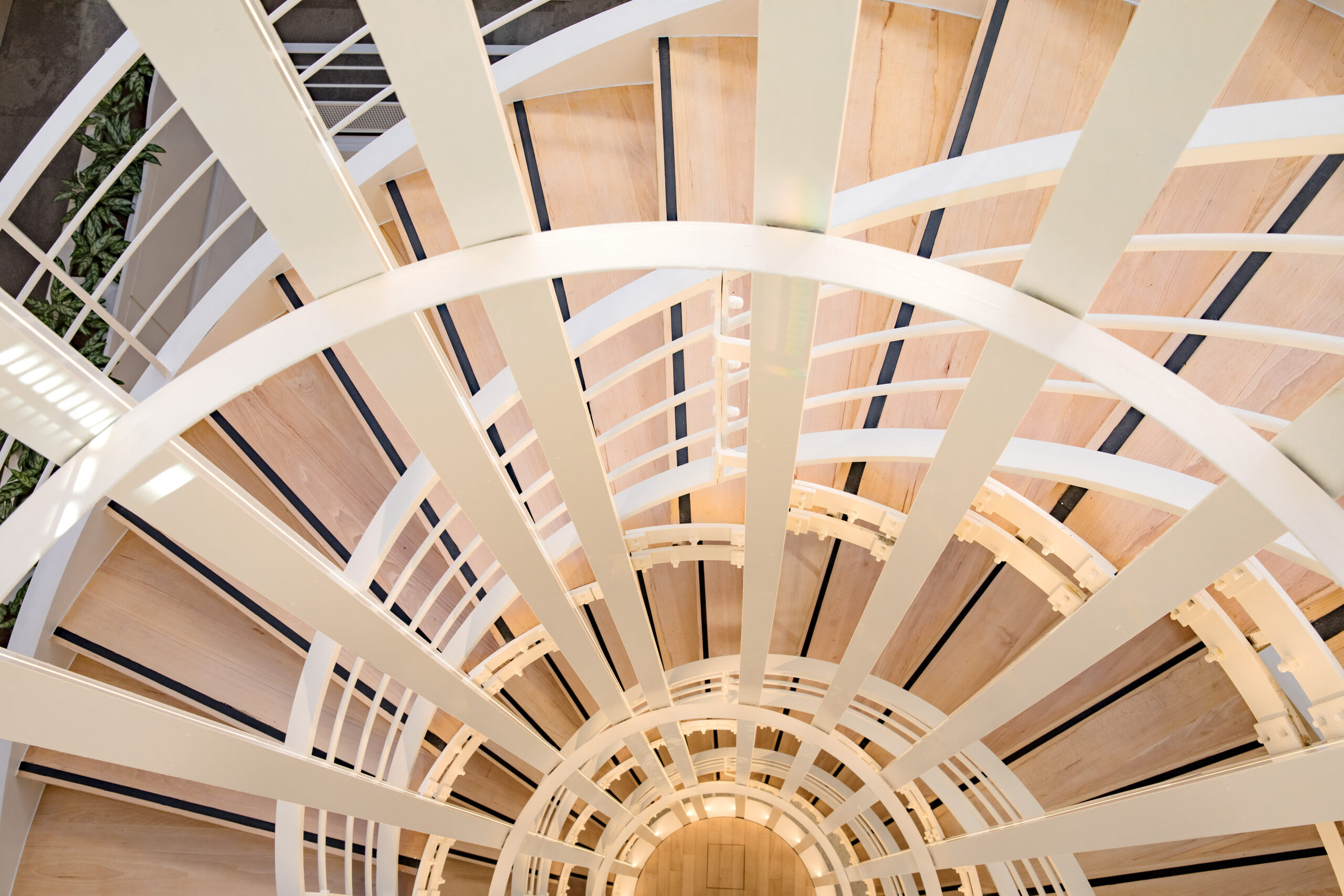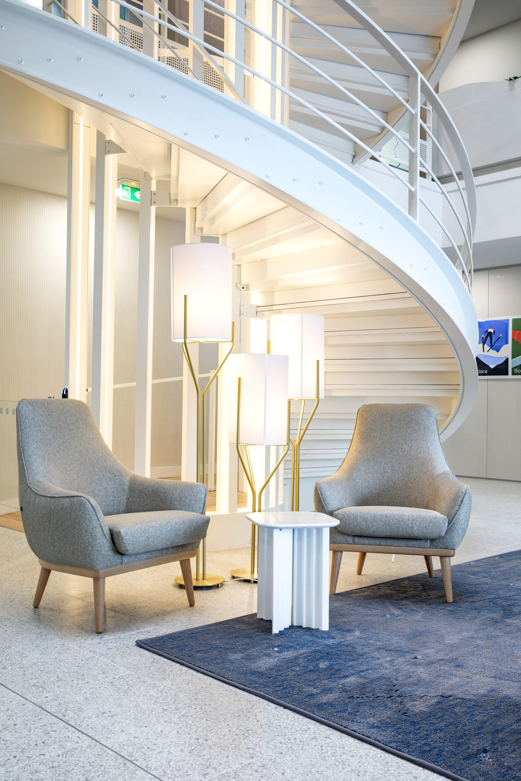 Les lignes fluides et aériennes de l'escalier créent un mouvement ascendant qui dynamise l'espace. Sa conception favorise la transparence et la circulation, participant ainsi à la philosophie de networking et d'échange voulue pour ces bureaux.