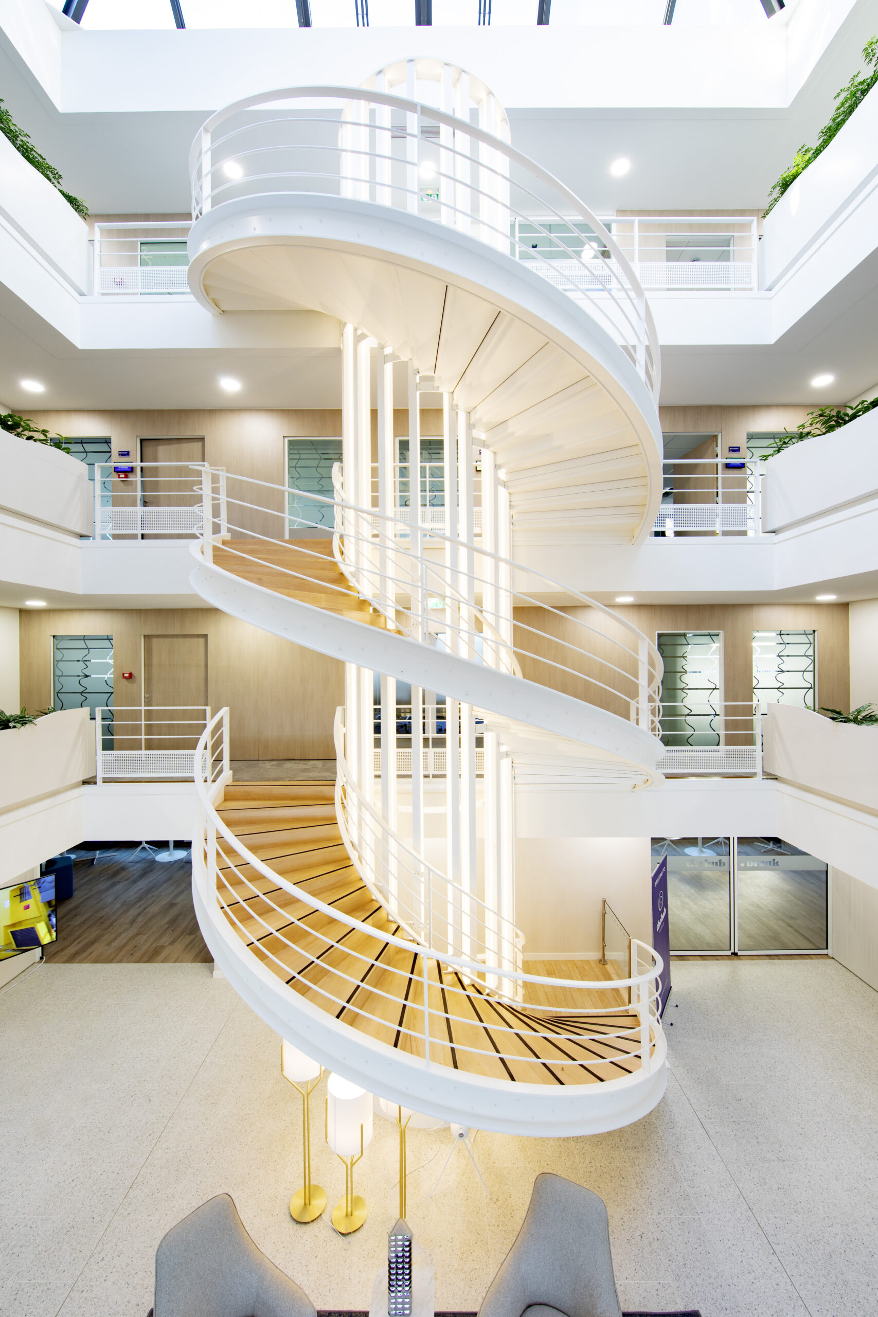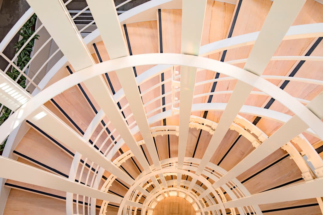 Pour le siège social d'Econocom à Puteaux, Volume ABC a imaginé un escalier en colimaçon qui réinvente les codes de l'espace de travail. Cette création sculpturale d'Aliénor Bechu devient un élément architectural fort qui incarne l'esprit d'innovation de l'entreprise.