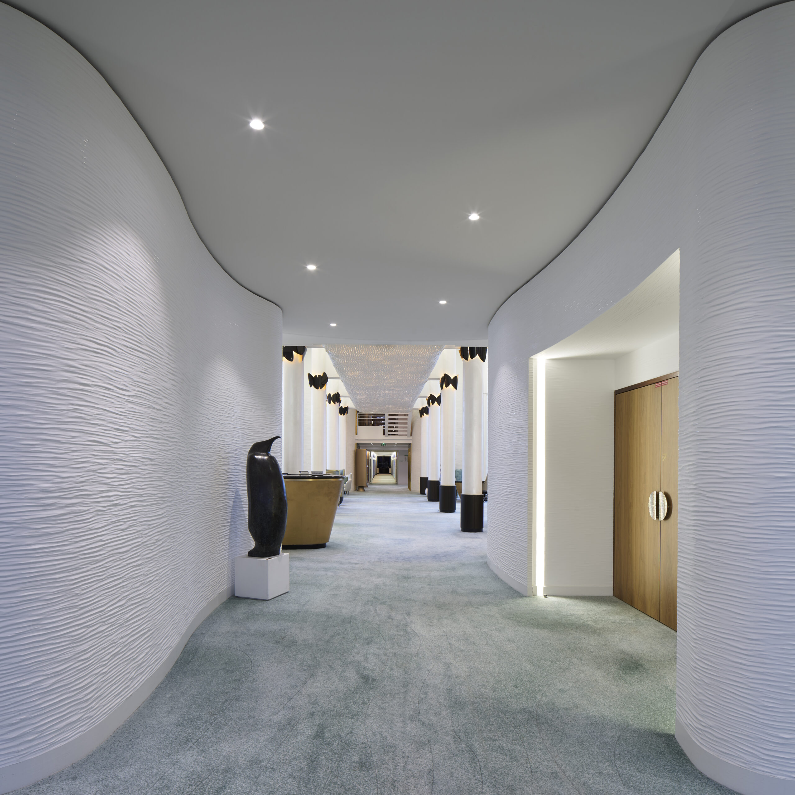 Le plafond ondulant, parsemé d'organismes nacrés semblant flotter dans l'espace, crée une atmosphère subaquatique unique. Cette création originale dialogue harmonieusement avec les textures murales évoquant les reflets marins et les mouvements des vagues.