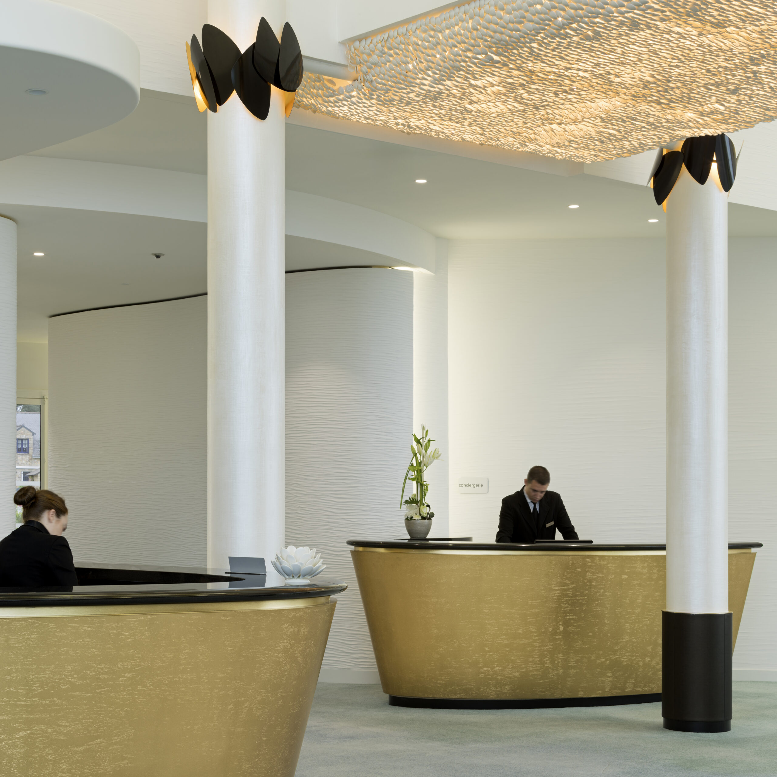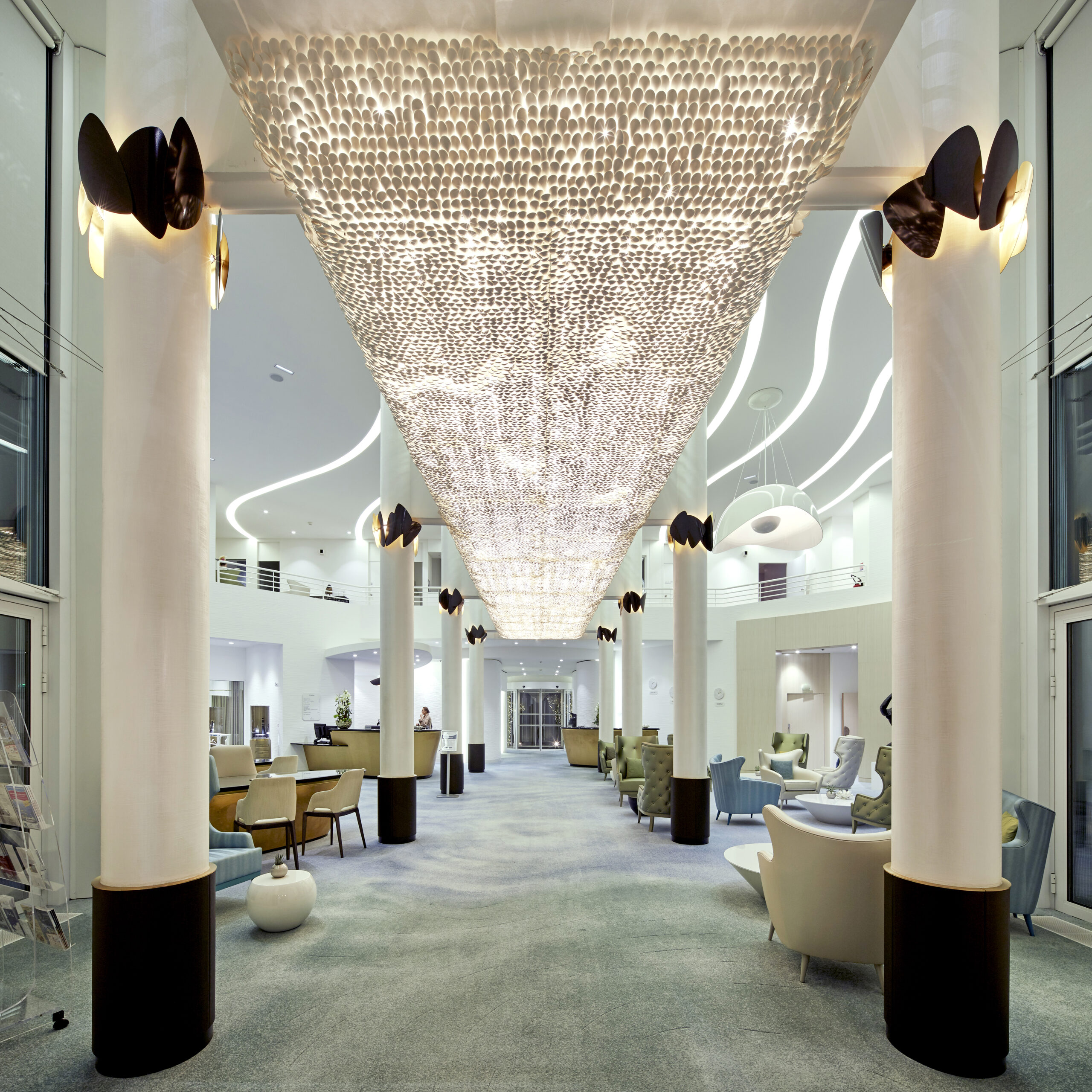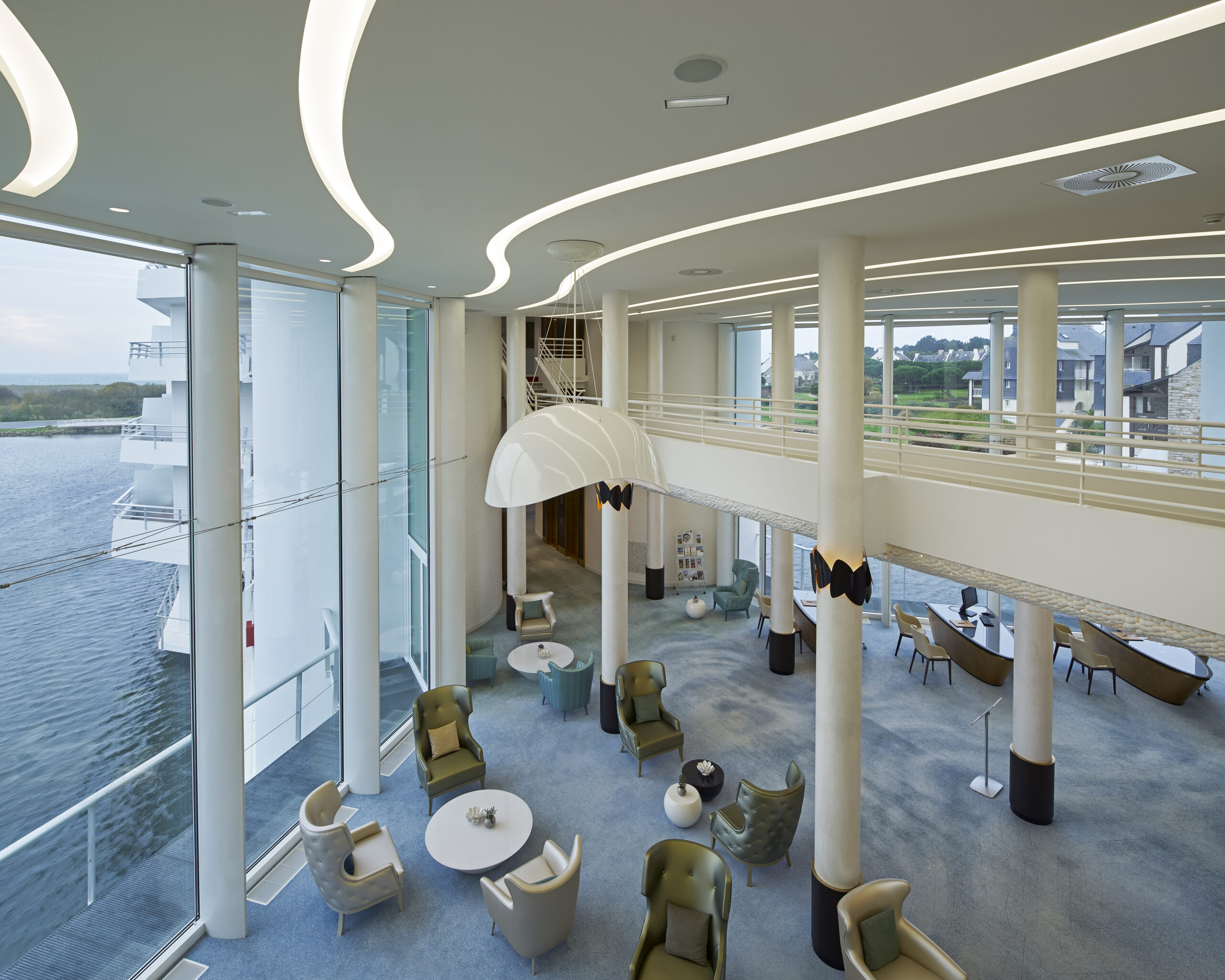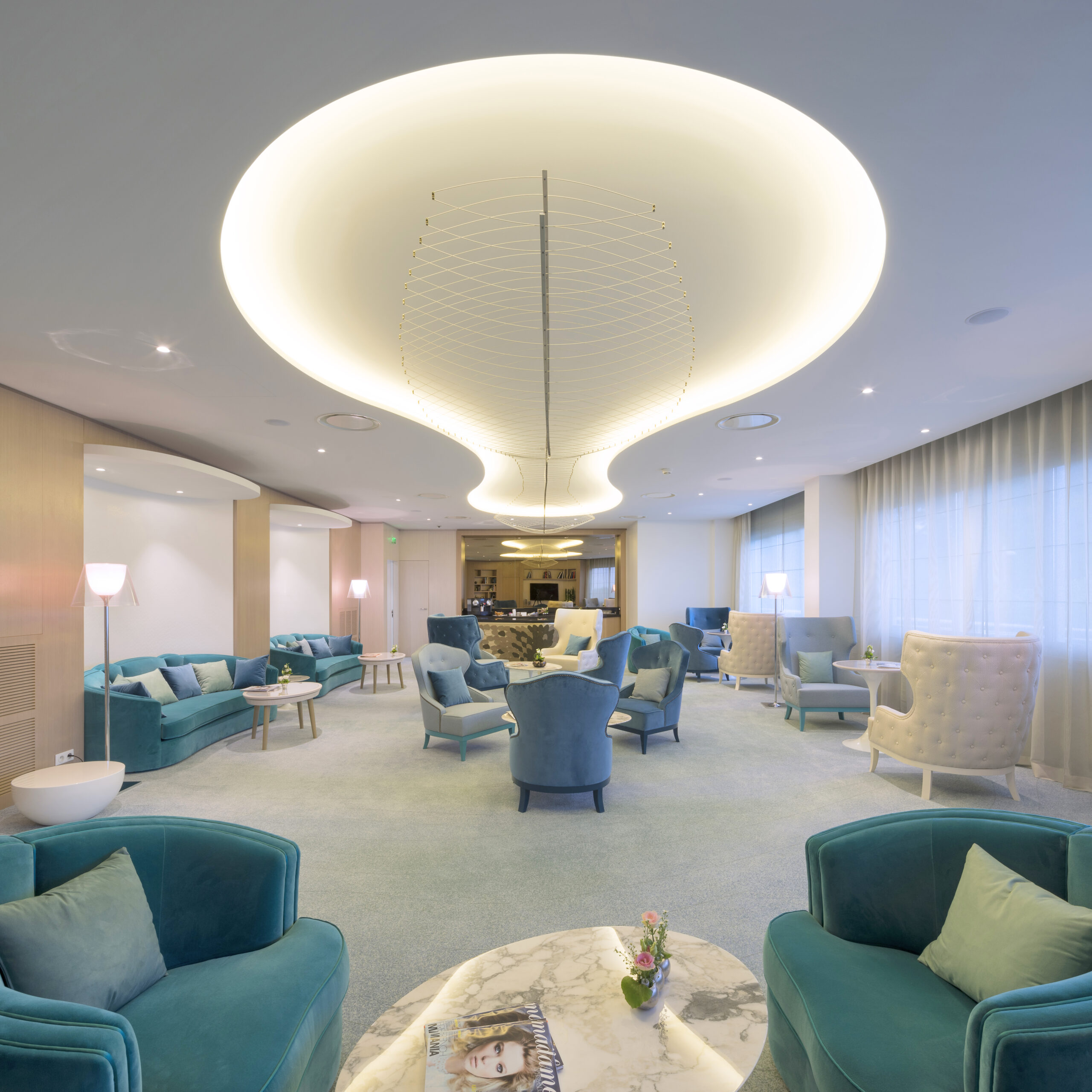 Clair et lumineux, le plafond est comme habité par quelques organismes nacrés vivants. Dans ce décor, les éléments mobiliers font appel à des images de proues de bateaux et de navettes. Tandis qu’un mouvement au sol évoque les courants marins, le plafond se veut clair et lumineux, et est composé de courbes et de luminaires nacrés qui font penser à de vrais organismes vivants. En son sein, la passerelle, pièce maîtresse des lieux, reflète les mouvements du sol et s’habille d’une peau nacrée qui la sublime, l’illumine, et lui donne son identité. Pour rester en lien avec sa majesté, les gardes corps sont redessinés à l’image des grands paquebots d’autrefois. L’espace de thalassothérapie mène le visiteur sous la mer où la nature reprend ses droits. Les piliers sont par exemple habillés par des coquillages façon bouchots, le mobilier évoque les concrétions marines, le tout s’illumine grâce à l’utilisation de matières et de couleurs claires, associées à des jeux de lumières projetées qui évoquent la transparence de l’eau et font danser les espaces. Les chambres proposent enfin de changer d’échelle pour se mettre à celle du coquillage. Véritables écrins nacrés, blancs et argentés, et particulièrement lumineuses, elles affichent des formes arrondies et courbes avec comme grand objectif de procurer confort, bien-être et repos.