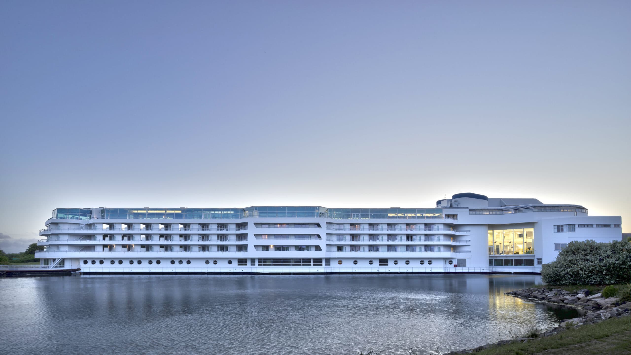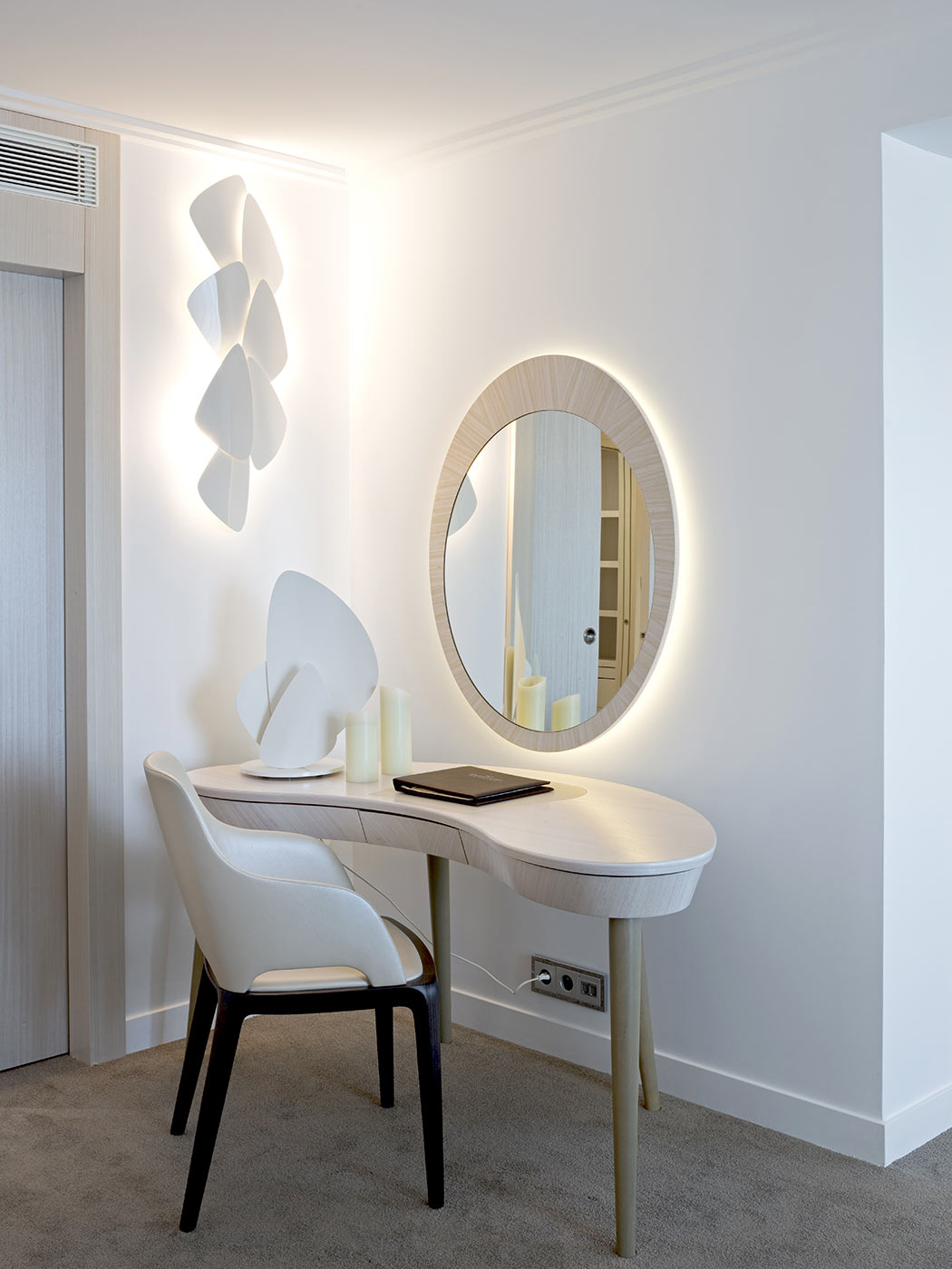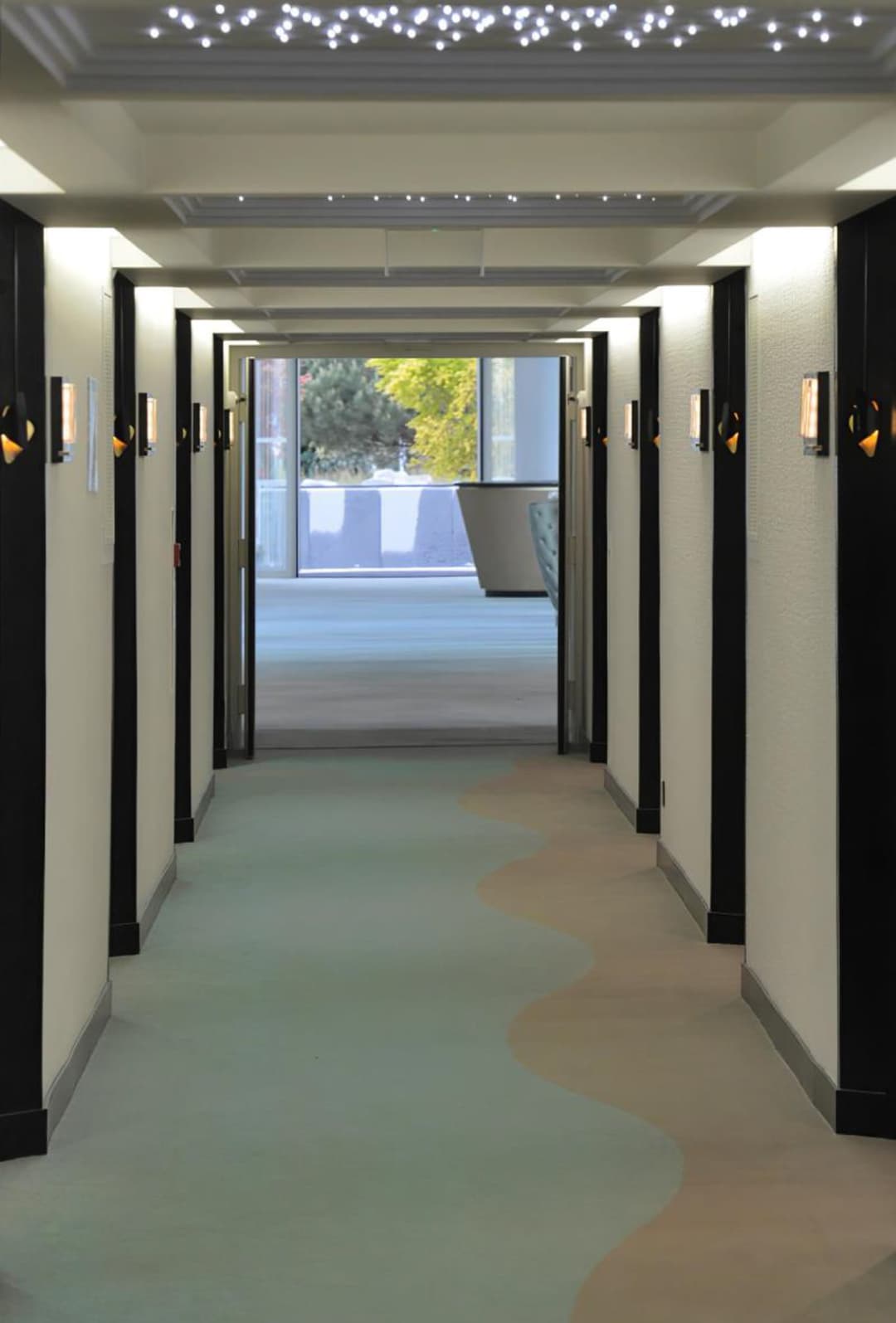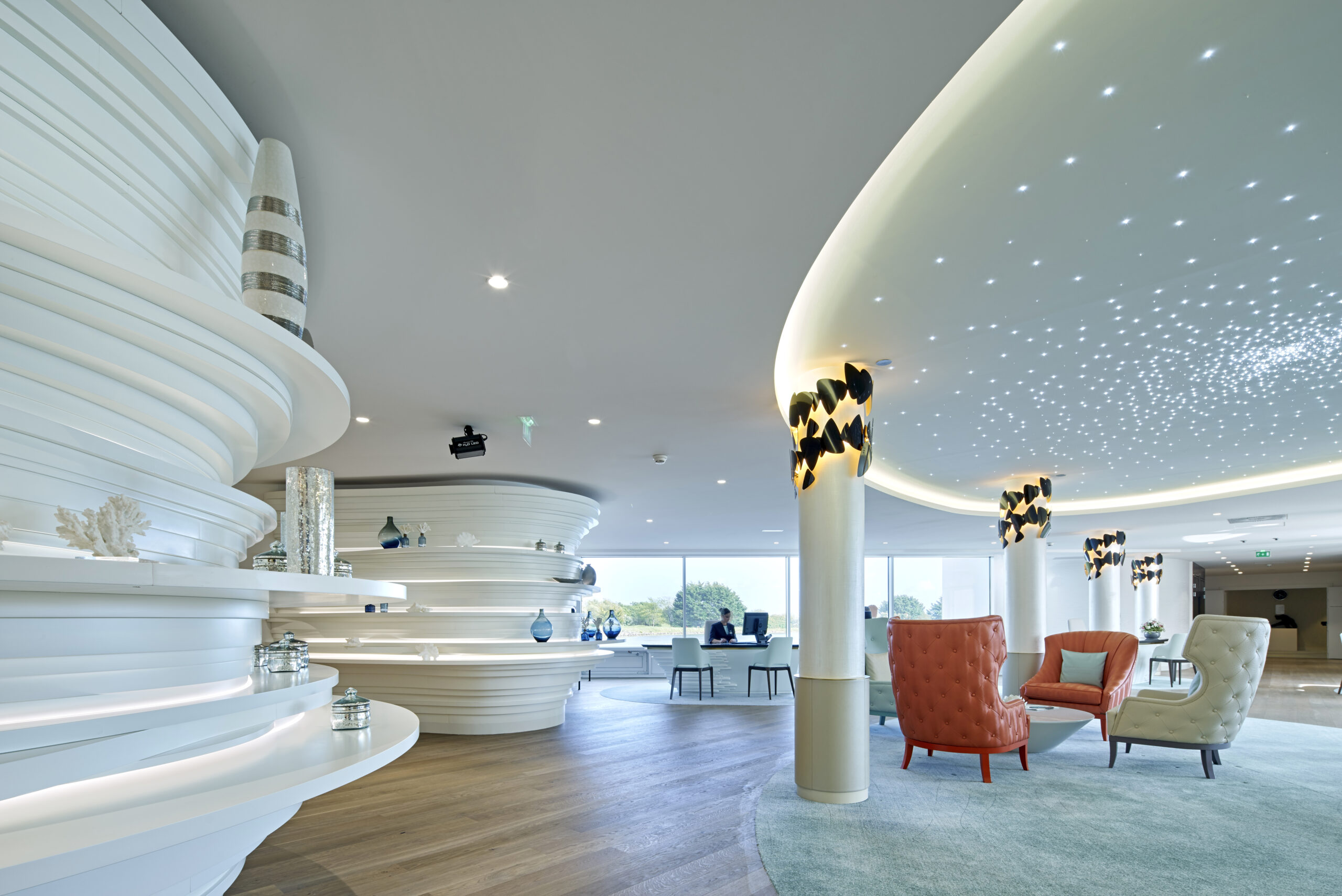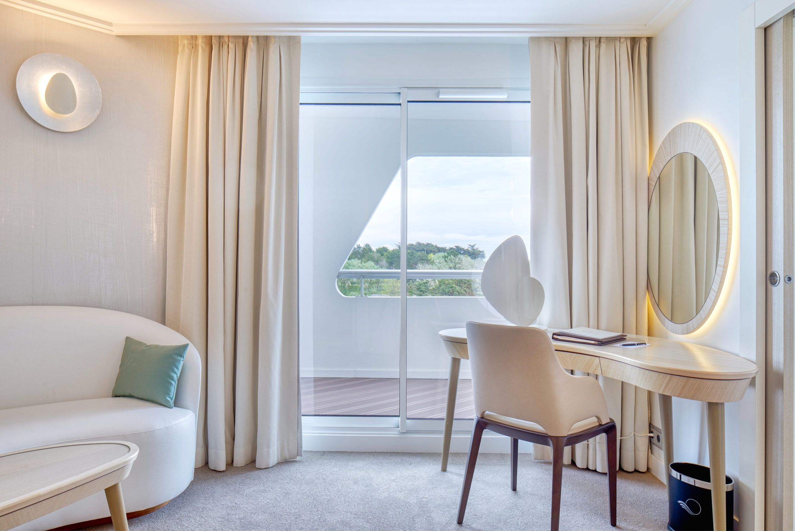 Clair et lumineux, le plafond est comme habité par quelques organismes nacrés vivants. Dans ce décor, les éléments mobiliers font appel à des images de proues de bateaux et de navettes. Tandis qu’un mouvement au sol évoque les courants marins, le plafond se veut clair et lumineux, et est composé de courbes et de luminaires nacrés qui font penser à de vrais organismes vivants. En son sein, la passerelle, pièce maîtresse des lieux, reflète les mouvements du sol et s’habille d’une peau nacrée qui la sublime, l’illumine, et lui donne son identité. Pour rester en lien avec sa majesté, les gardes corps sont redessinés à l’image des grands paquebots d’autrefois. L’espace de thalassothérapie mène le visiteur sous la mer où la nature reprend ses droits. Les piliers sont par exemple habillés par des coquillages façon bouchots, le mobilier évoque les concrétions marines, le tout s’illumine grâce à l’utilisation de matières et de couleurs claires, associées à des jeux de lumières projetées qui évoquent la transparence de l’eau et font danser les espaces. Les chambres proposent enfin de changer d’échelle pour se mettre à celle du coquillage. Véritables écrins nacrés, blancs et argentés, et particulièrement lumineuses, elles affichent des formes arrondies et courbes avec comme grand objectif de procurer confort, bien-être et repos.