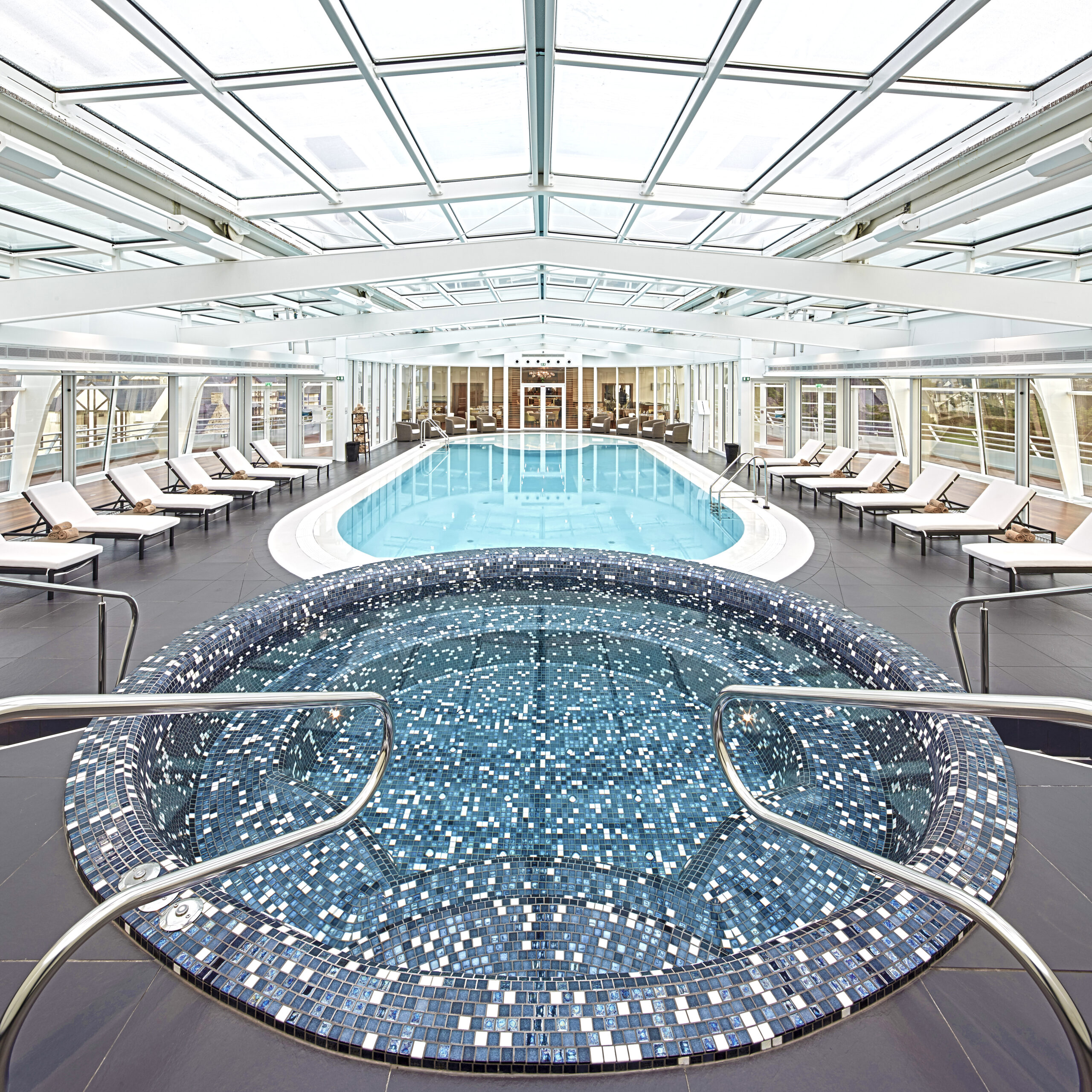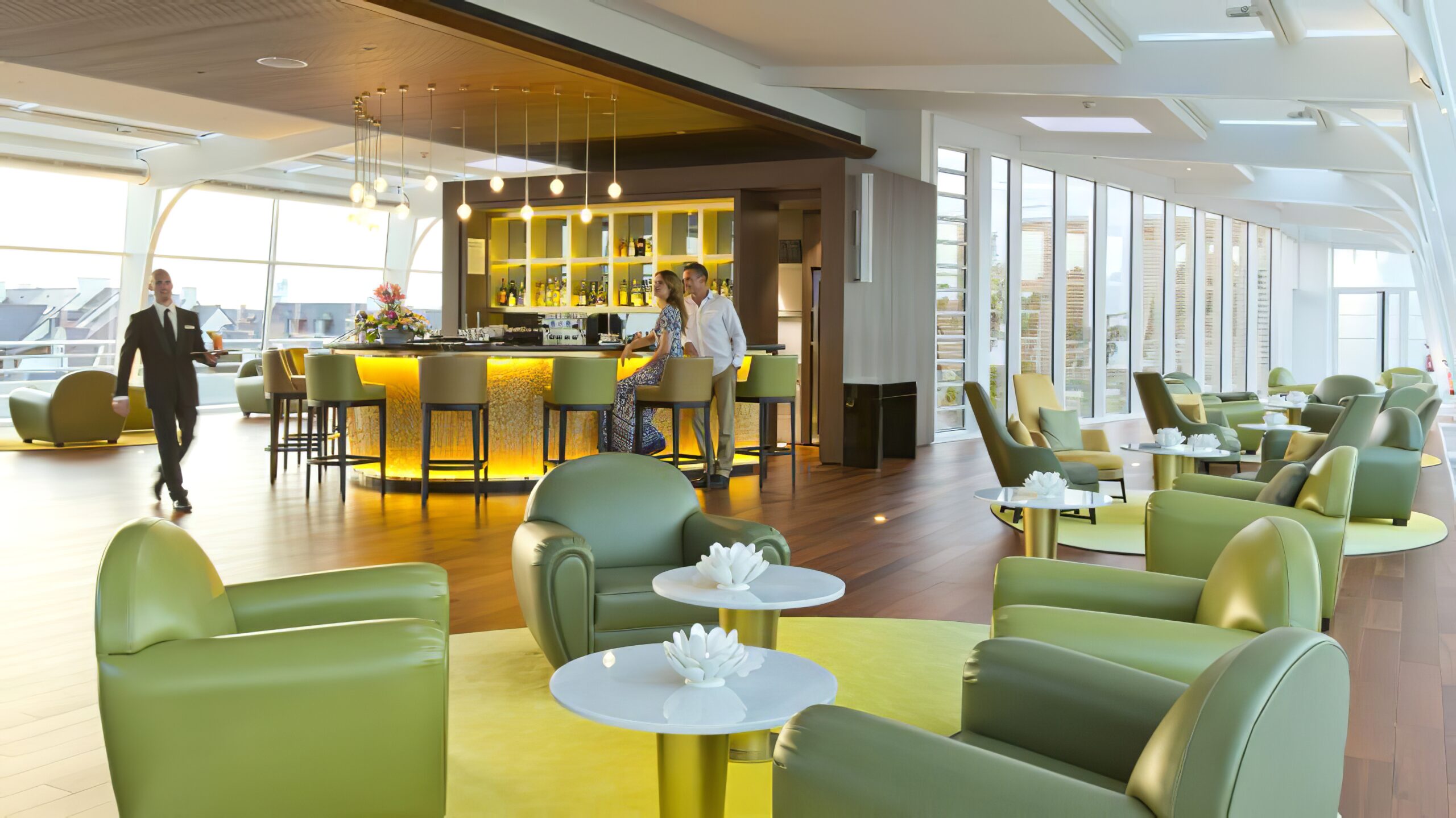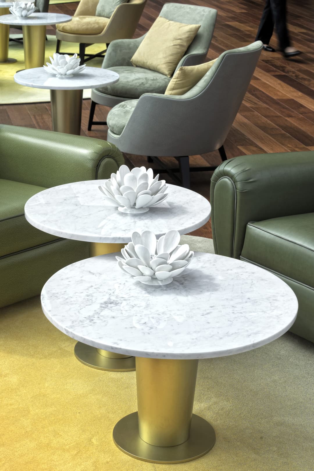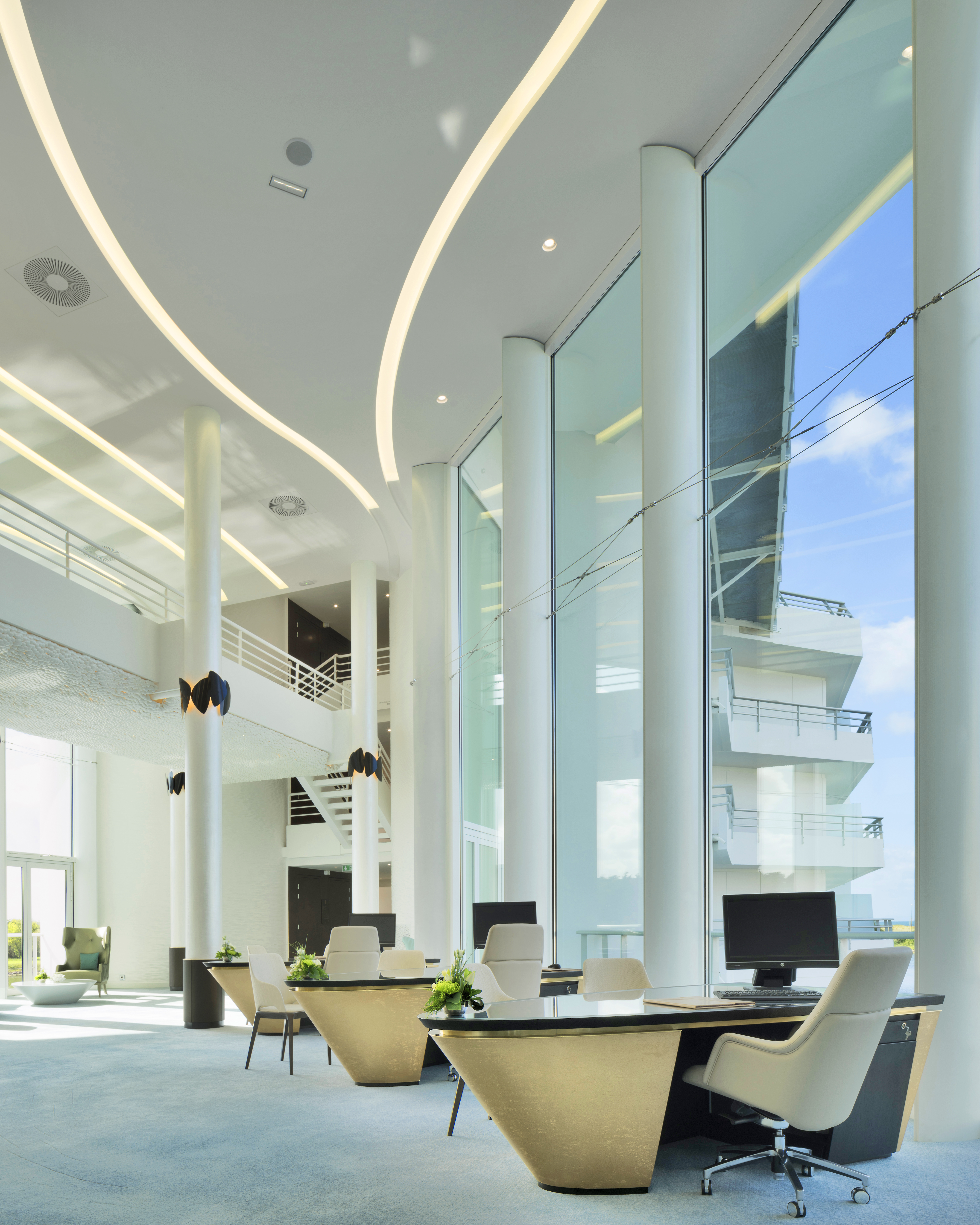 Clair et lumineux, le plafond est comme habité par quelques organismes nacrés vivants. Dans ce décor, les éléments mobiliers font appel à des images de proues de bateaux et de navettes. Tandis qu’un mouvement au sol évoque les courants marins, le plafond se veut clair et lumineux, et est composé de courbes et de luminaires nacrés qui font penser à de vrais organismes vivants. En son sein, la passerelle, pièce maîtresse des lieux, reflète les mouvements du sol et s’habille d’une peau nacrée qui la sublime, l’illumine, et lui donne son identité. Pour rester en lien avec sa majesté, les gardes corps sont redessinés à l’image des grands paquebots d’autrefois. L’espace de thalassothérapie mène le visiteur sous la mer où la nature reprend ses droits. Les piliers sont par exemple habillés par des coquillages façon bouchots, le mobilier évoque les concrétions marines, le tout s’illumine grâce à l’utilisation de matières et de couleurs claires, associées à des jeux de lumières projetées qui évoquent la transparence de l’eau et font danser les espaces. Les chambres proposent enfin de changer d’échelle pour se mettre à celle du coquillage. Véritables écrins nacrés, blancs et argentés, et particulièrement lumineuses, elles affichent des formes arrondies et courbes avec comme grand objectif de procurer confort, bien-être et repos.