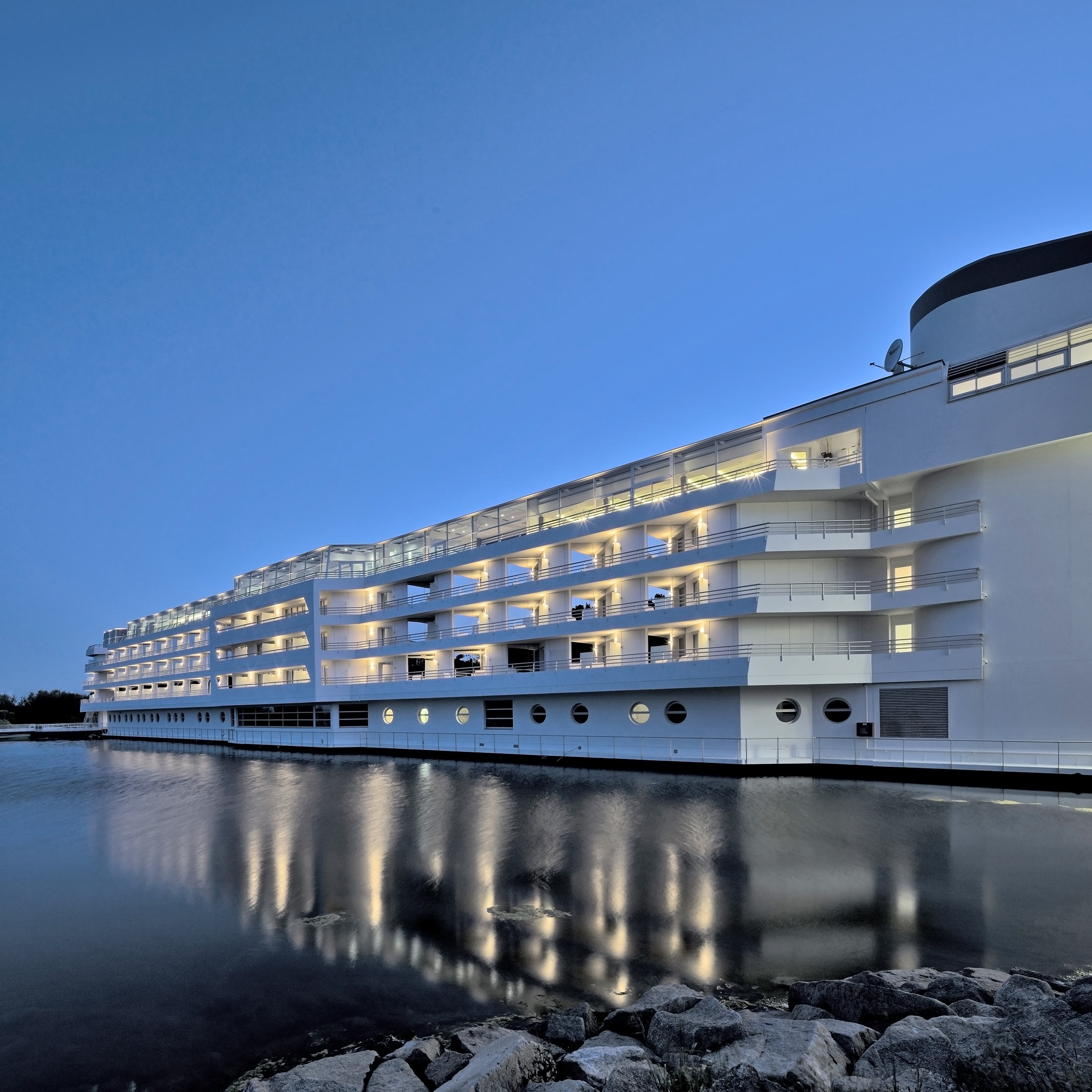L'aménagement intérieur réinvente les codes de l'hôtellerie de luxe en proposant une expérience immersive totale. Le mobilier, inspiré des proues de bateaux, s'intègre parfaitement dans ce décor évoquant un port de pêche sophistiqué.