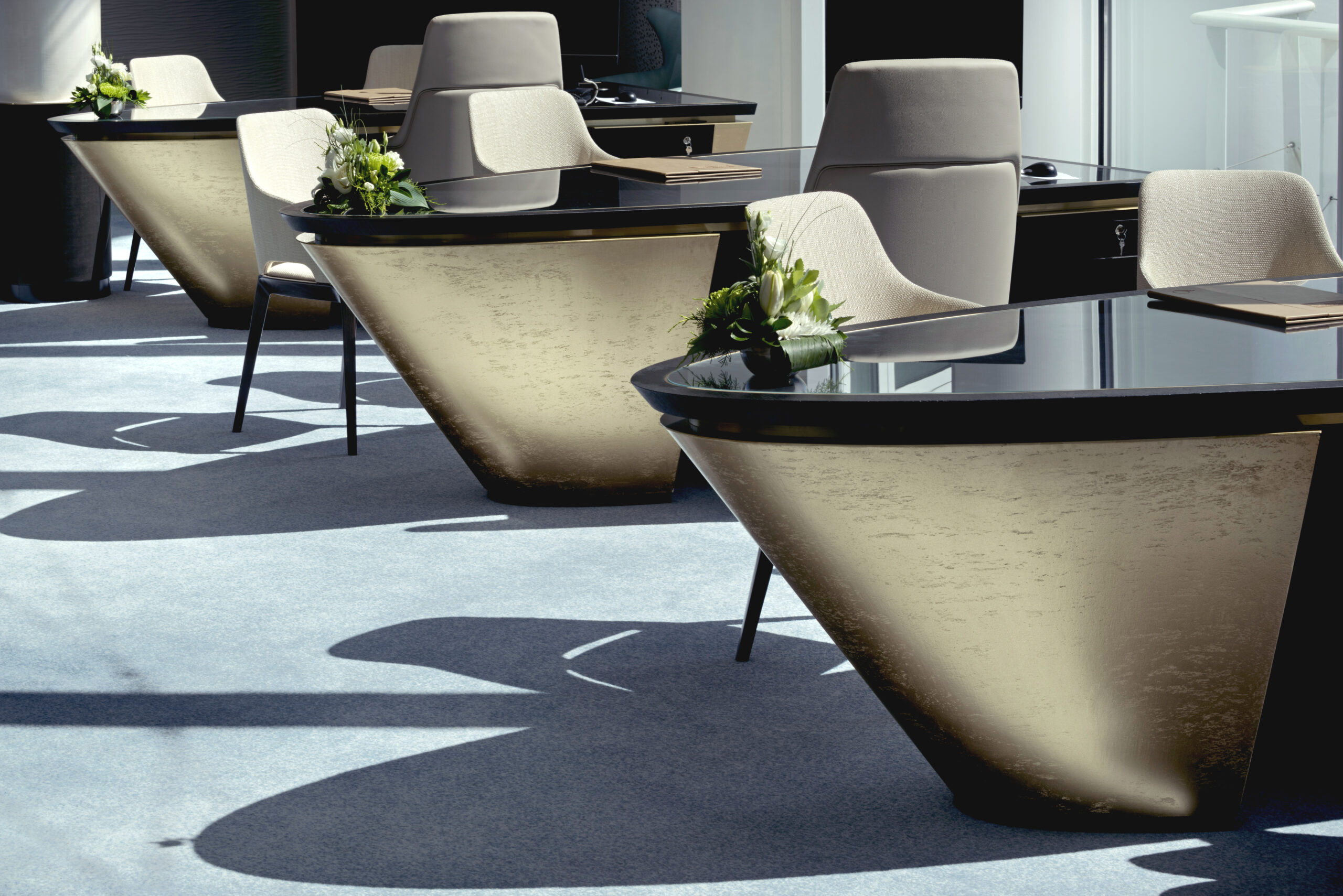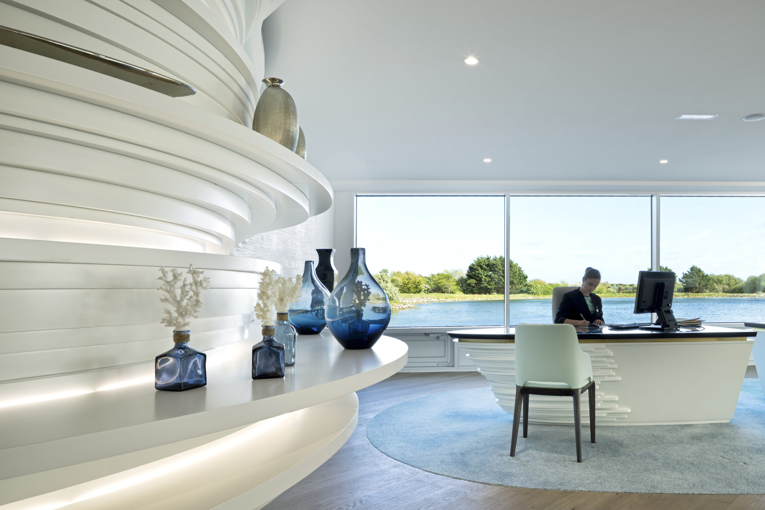 Immersion au cœur d’un écosystème marin. S’inspirer des mondes animal et végétal de la mer. Créer un écrin de bien-être propice au repos et à la détente. A mi-parcours entre coquillages, nacres et reflets d’eau, la texture et les couleurs des parois du sas d’entrée évoquent les ondes de la mer et mènent les visiteurs vers un hall majestueux. Dans un décor qui évoque un port de pêche, les éléments mobiliers font appel à des images de proues de bateau tandis qu’un mouvement au sol imite les courant marins.