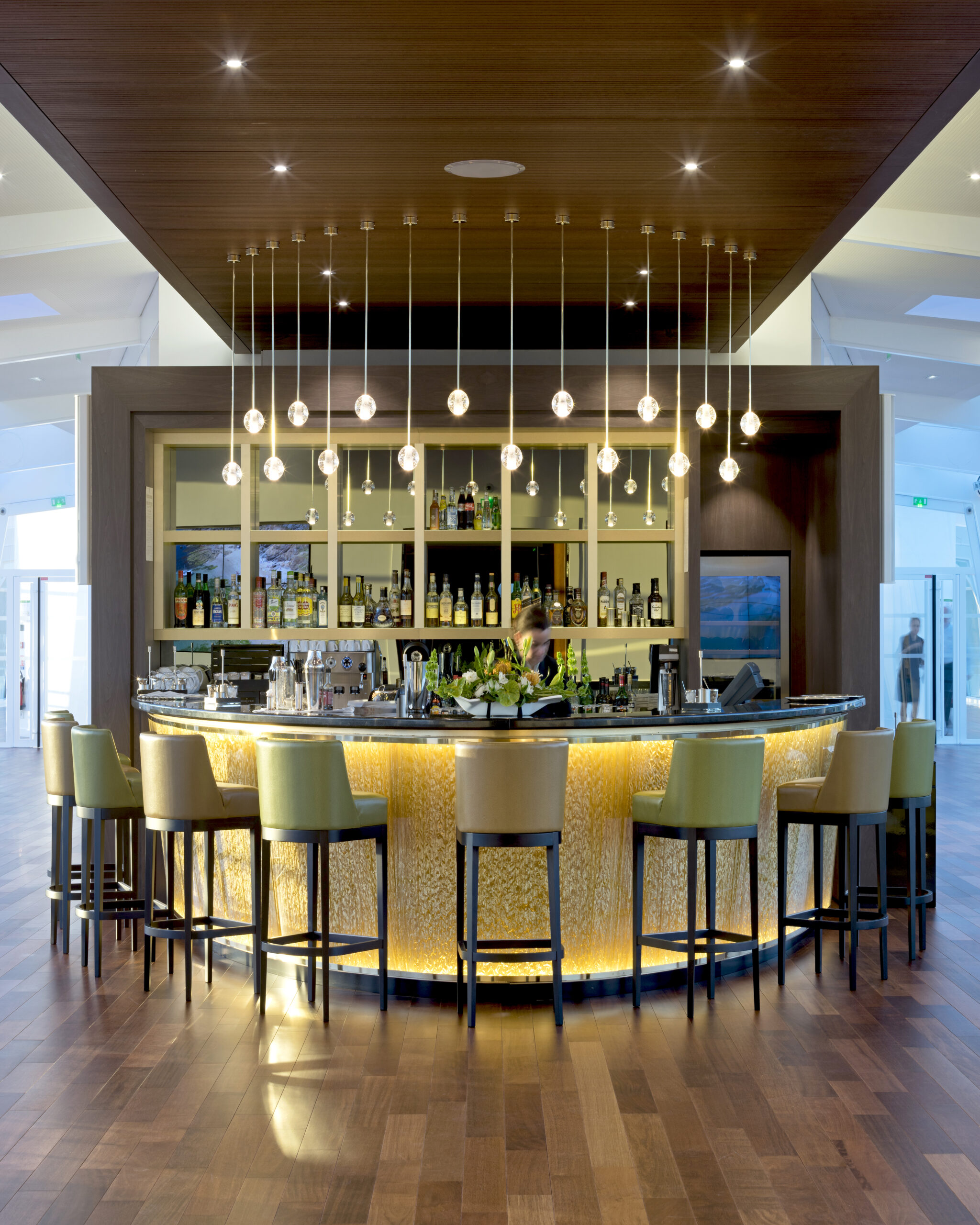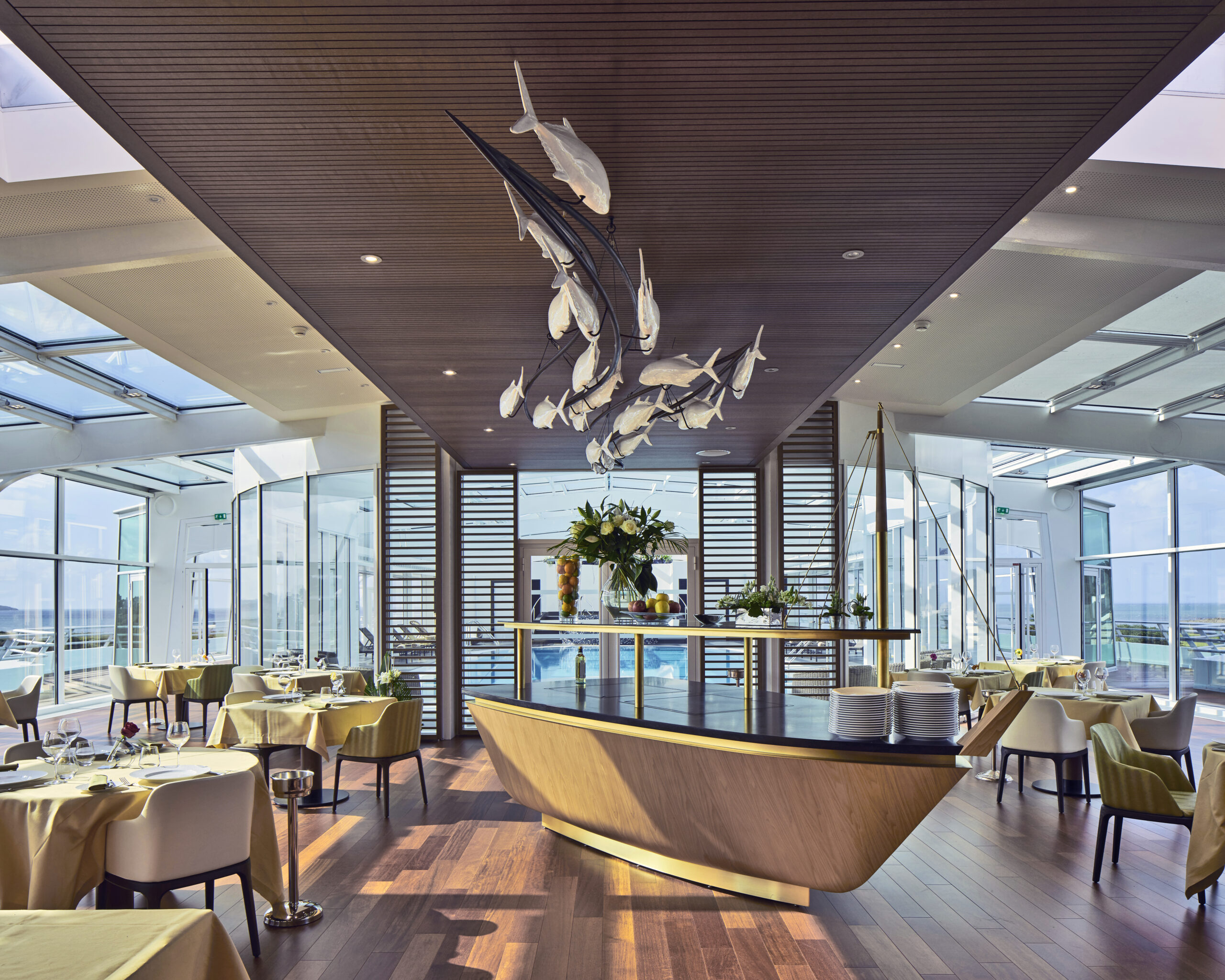 La scénographie du lieu prolonge l'atmosphère sous-marine de l'hôtel, créant une transition naturelle entre les espaces. Les matériaux et les finitions sélectionnés évoquent subtilement l'univers maritime tout en maintenant une élégance raffinée.
