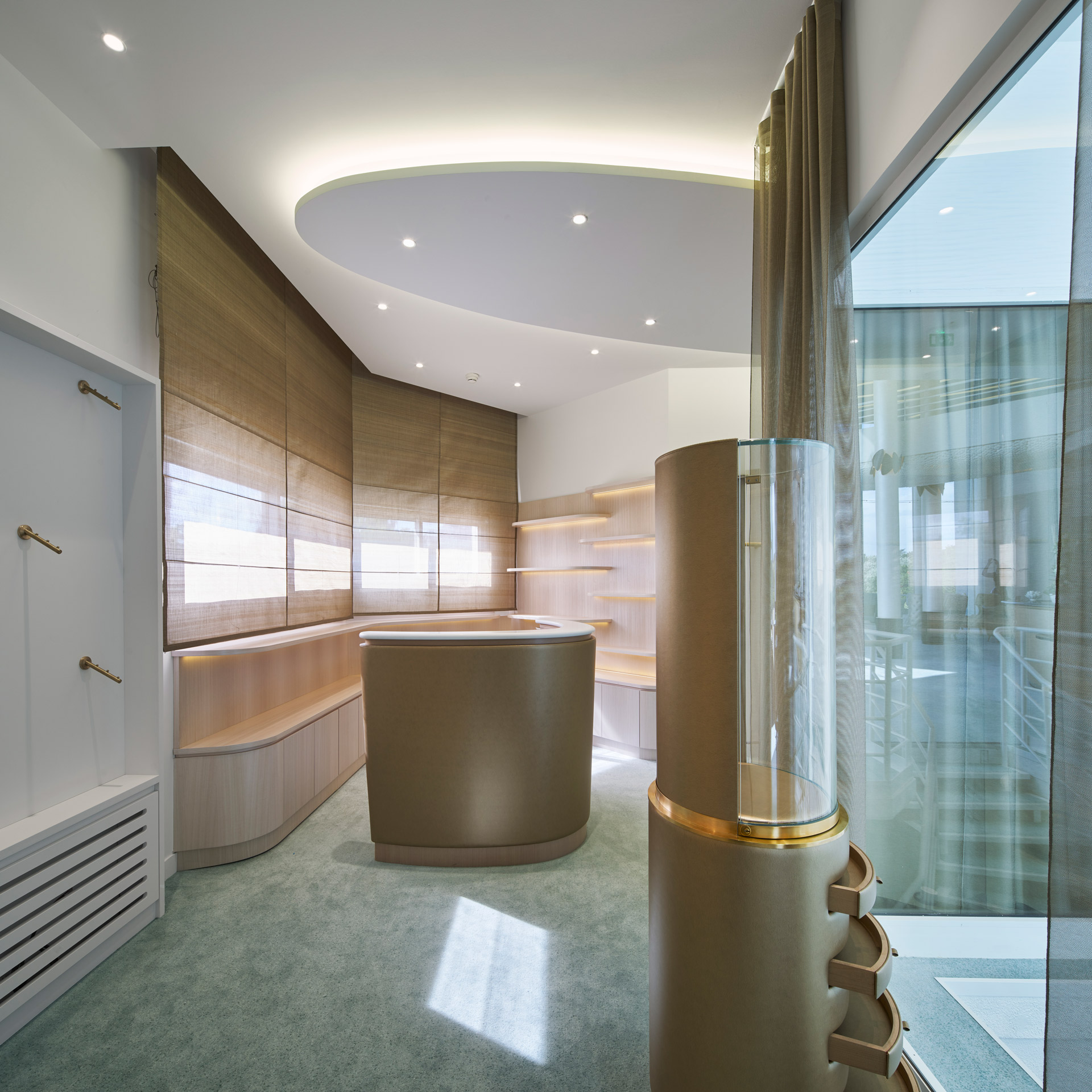 L'aménagement intérieur de la boutique joue sur les codes du monde marin tout en respectant les exigences d'un espace commercial haut de gamme. Les éléments de merchandising et le mobilier sur-mesure participent à créer une expérience shopping unique.