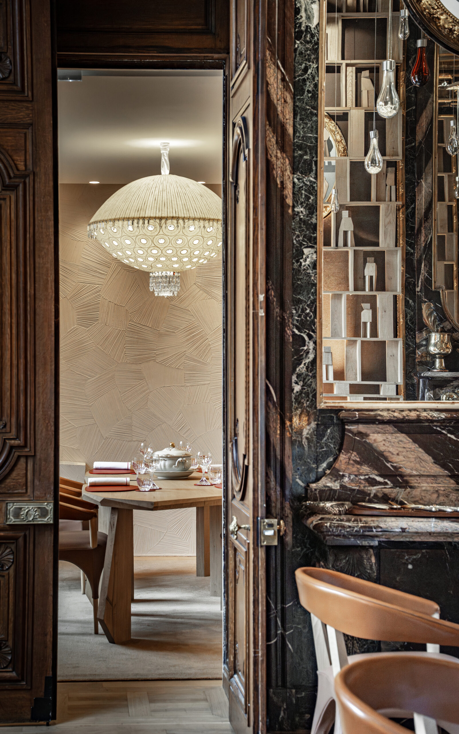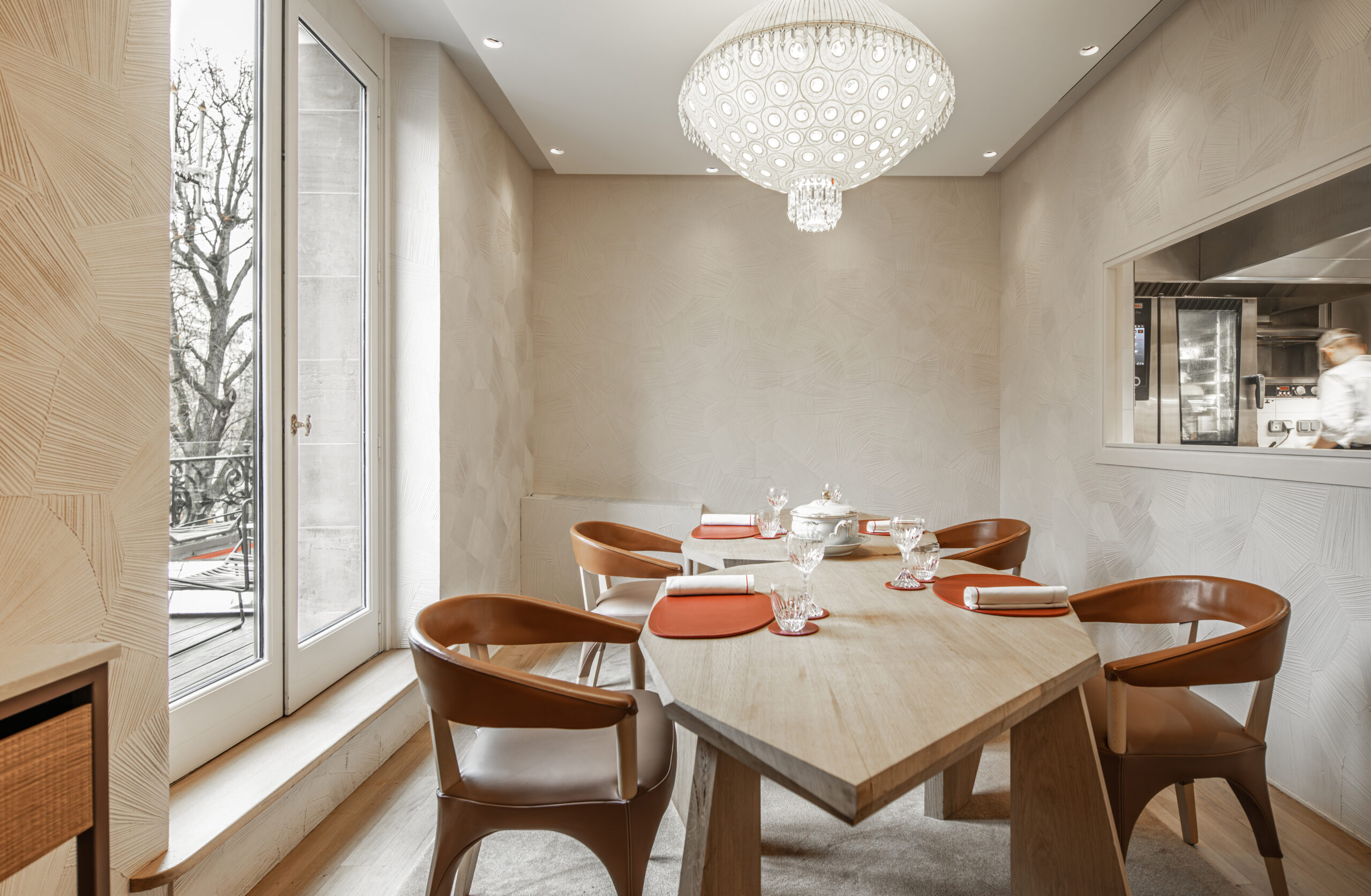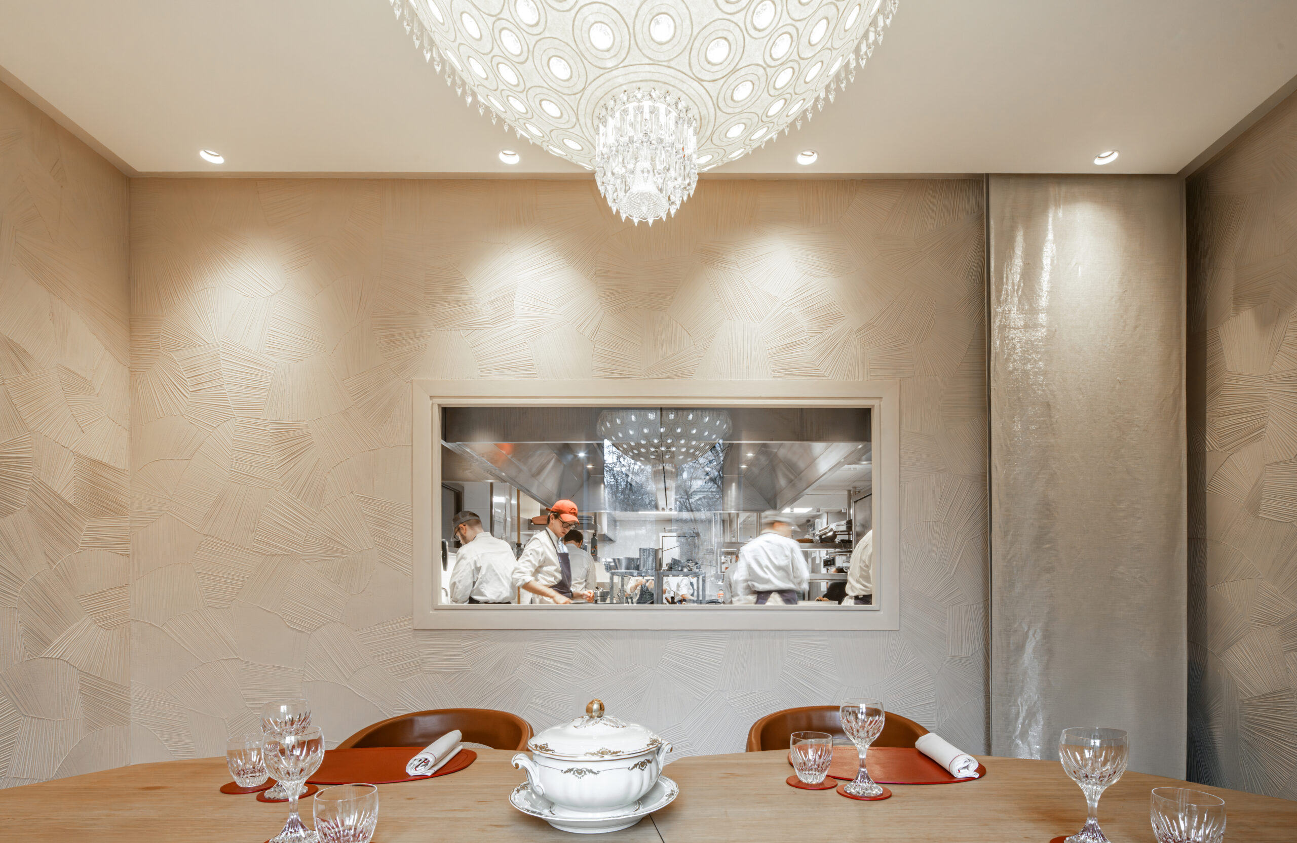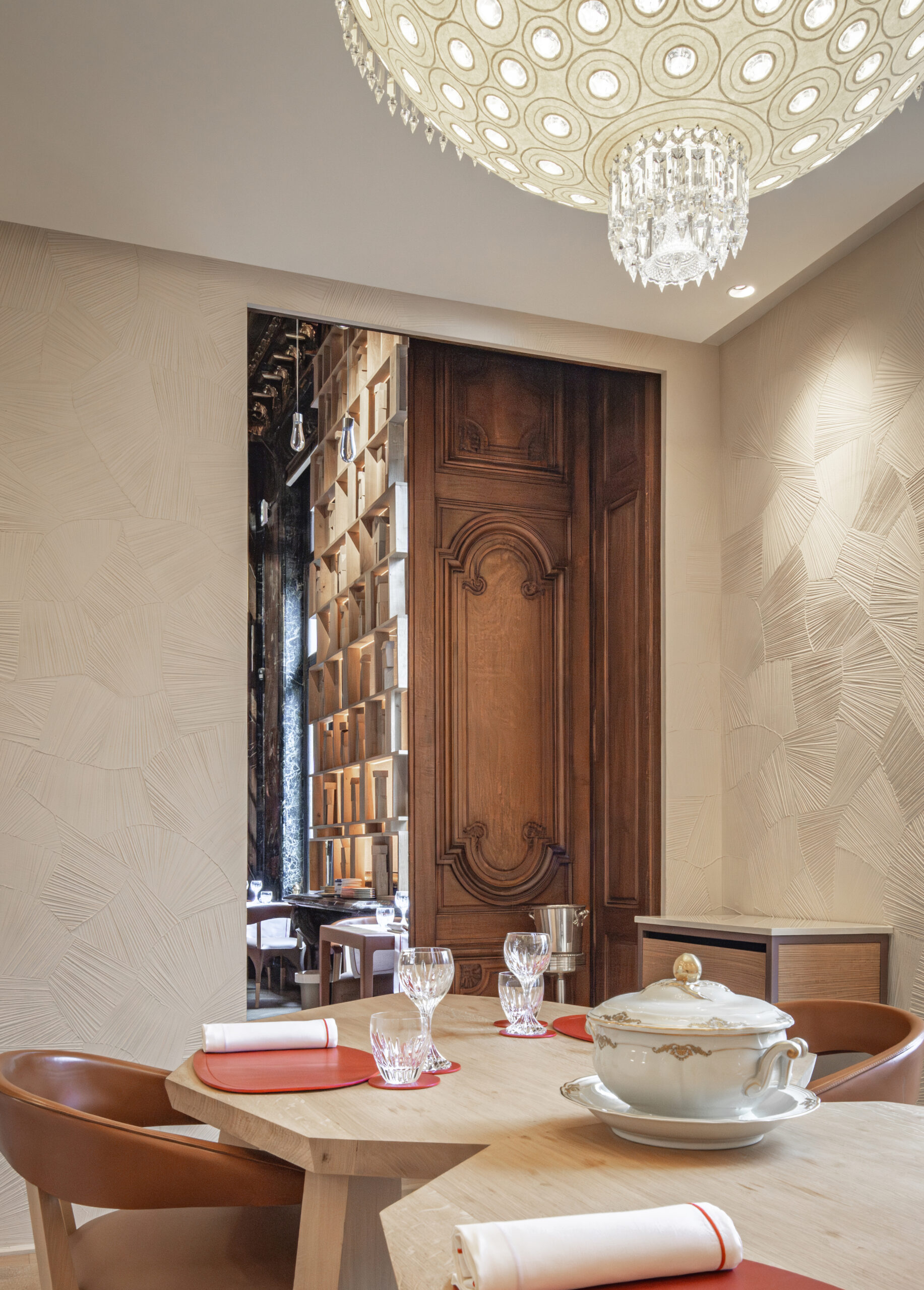 L'approche architecturale joue sur le contraste entre le brut et le raffiné. Les matériaux naturels et bio-sourcés - bois, cuir, céramique, chanvre - créent un dialogue avec le raffinement du cristal Baccarat. Les textures brutes rappellent le travail du chef étoilé, tandis que les éléments en cristal apportent une touche de préciosité.