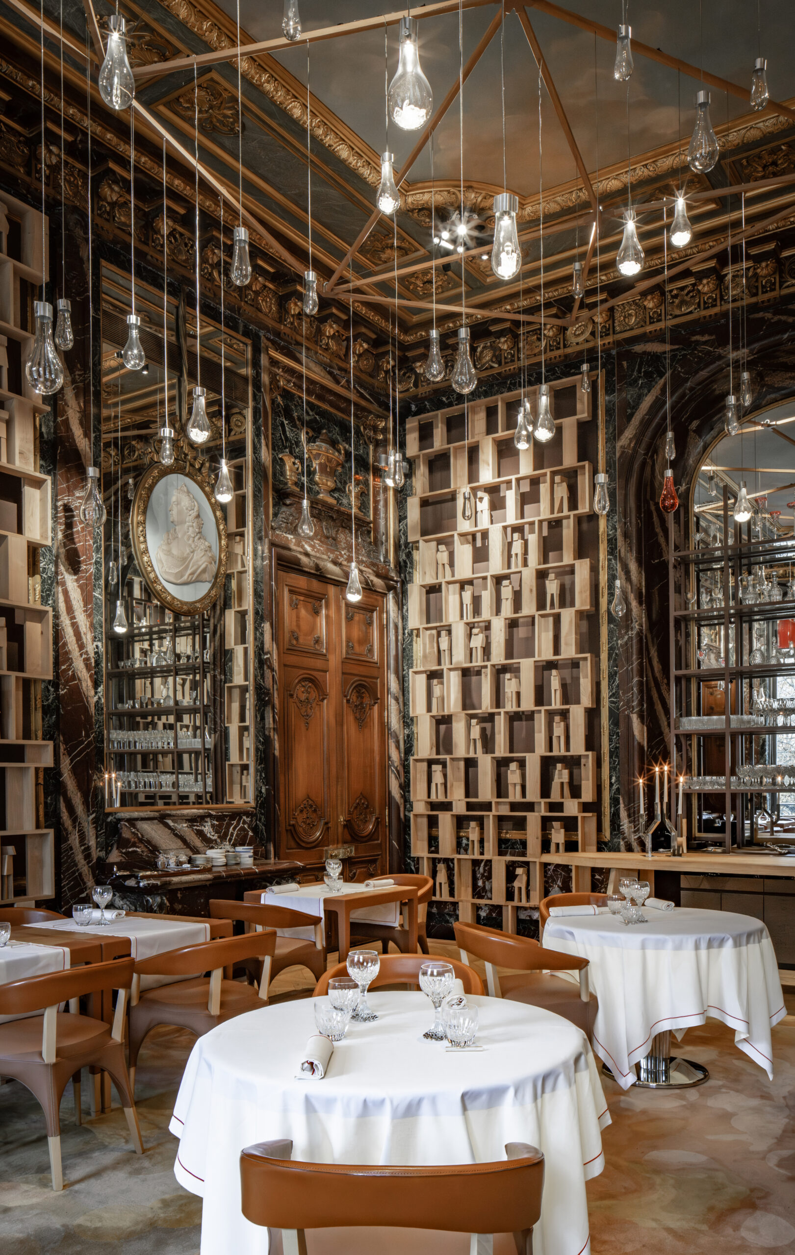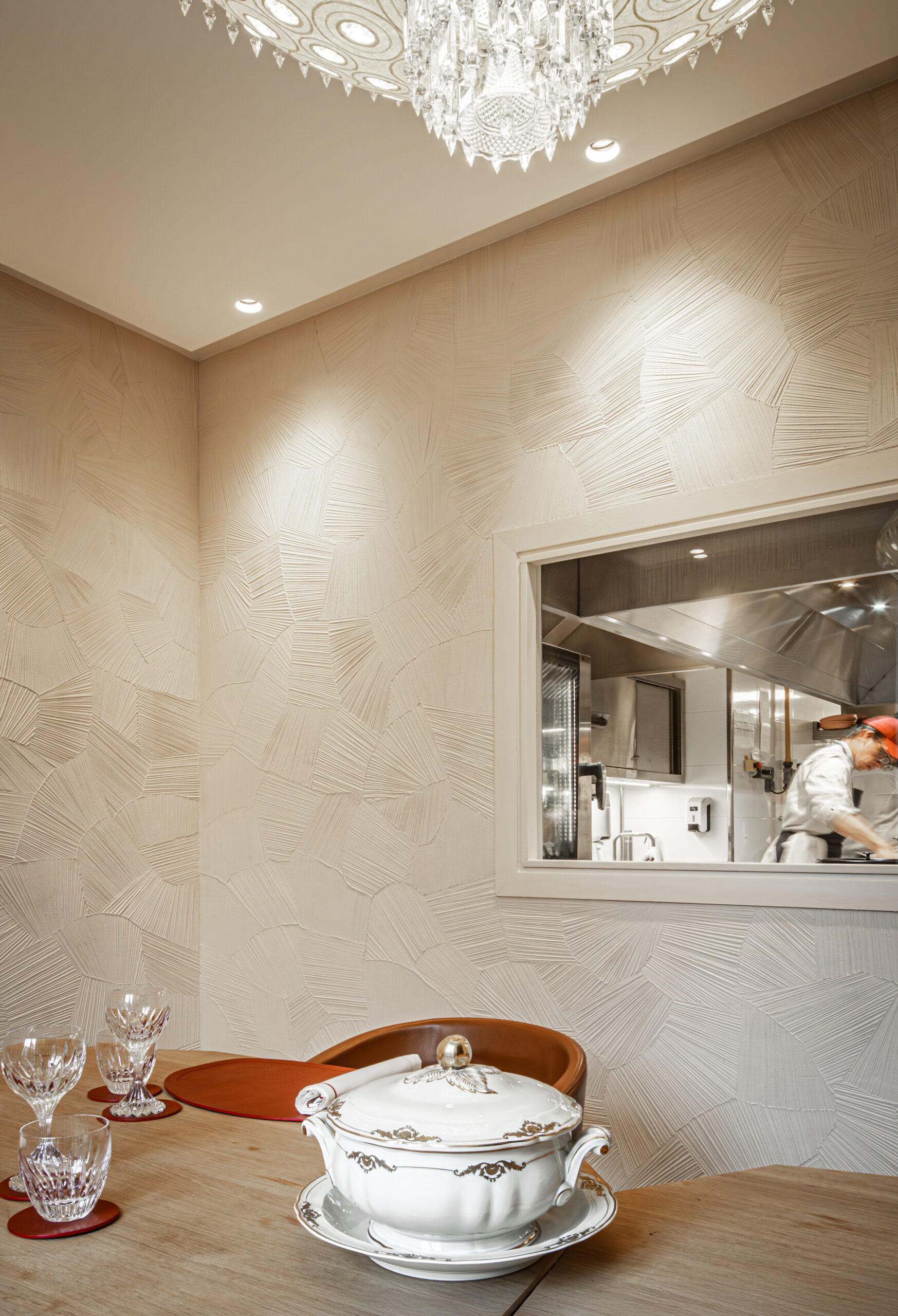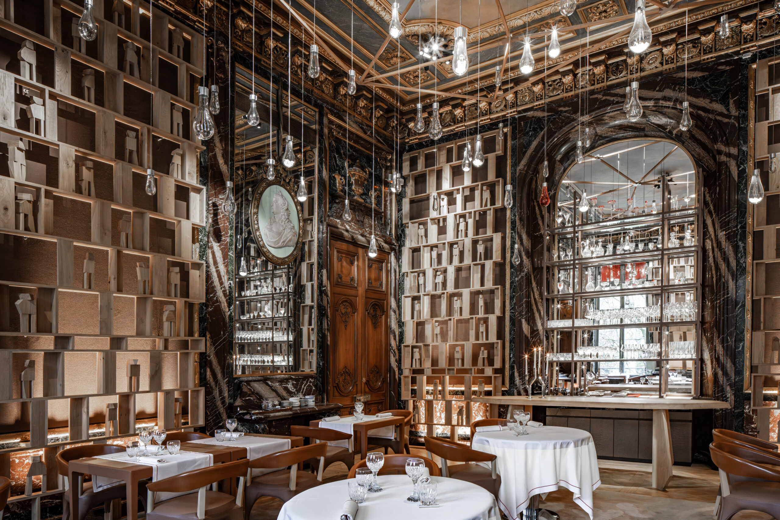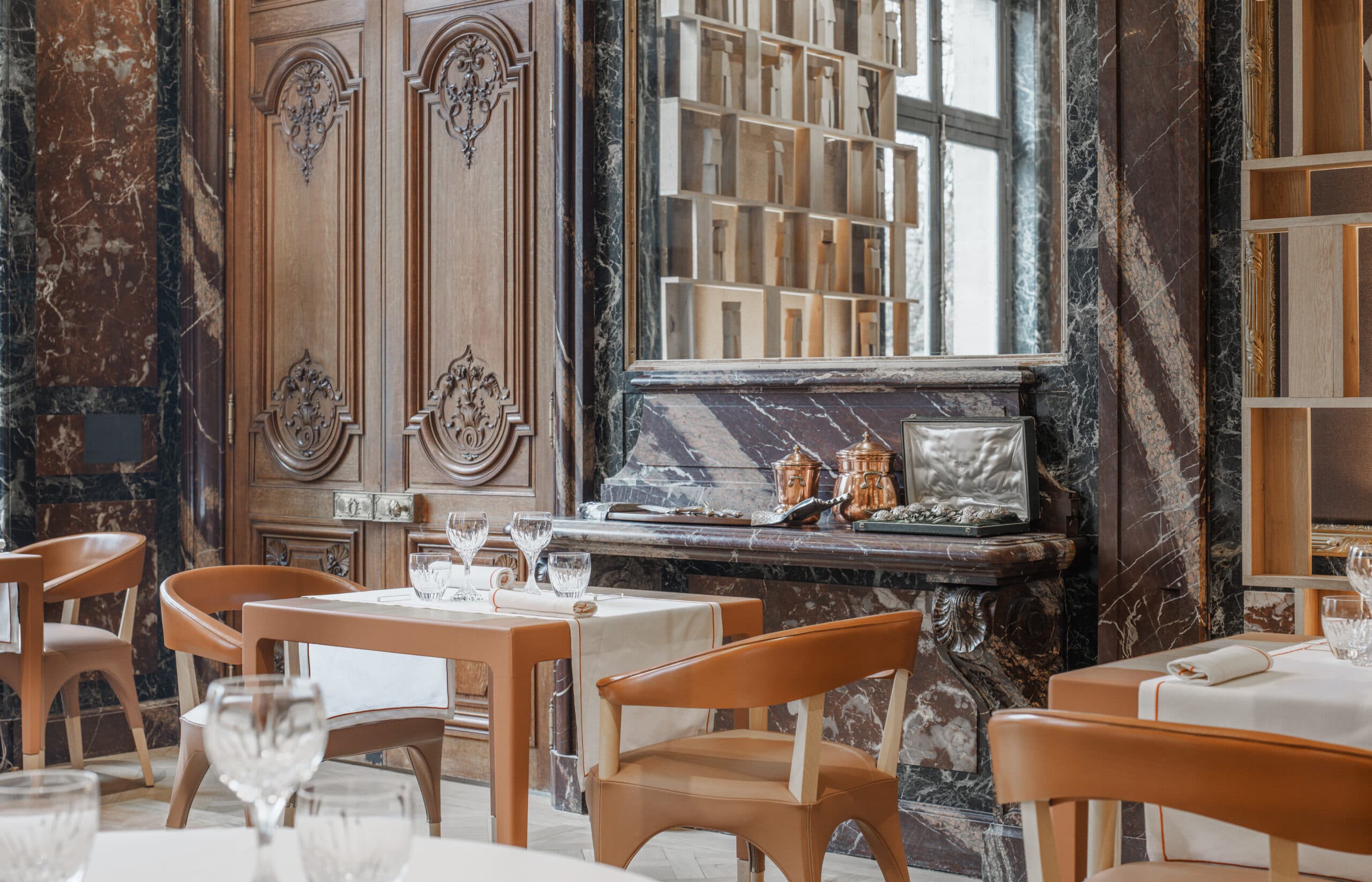 L'approche architecturale joue sur le contraste entre le brut et le raffiné. Les matériaux naturels et bio-sourcés - bois, cuir, céramique, chanvre - créent un dialogue avec le raffinement du cristal Baccarat. Les textures brutes rappellent le travail du chef étoilé, tandis que les éléments en cristal apportent une touche de préciosité.